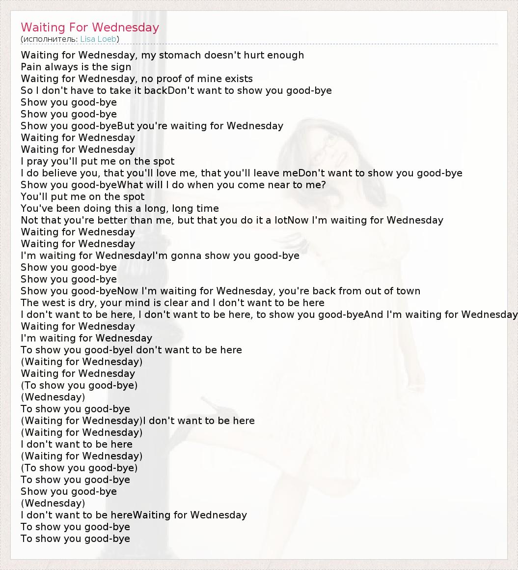 Waiting for Wednesday, my stomach doesn't hurt enough Pain always is the sign Waiting for Wednesday, no proof of mine exists So l don't have to take it backDon't want to show you good-bye Show you good-bye Show you good-bye Show you good-byeBut you're waiting for Wednesday Waiting for Wednesday Waiting for Wednesday I pray you'll put me on the spot I do believe you, that you'll love me, that you'll leave meDon't want to show you good-bye Show you good-byeWhat will I do when you come near to me? You'll put me on the spot You've been doing this a long, long time Not that you're better than me, but that you do it a lotNow I'm waiting for Wednesday Waiting for Wednesday Waiting for Wednesday I'm waiting for WednesdayI'm gonna show you good-bye Show you good-bye Show you good-bye Show you good-byeNow I'm waiting for Wednesday, you're back from out of town The west is dry, your mind is clear and I don't want to be here I don't want to be here, I don't want to be here, to show you good-byeAnd I'm waiting for Wednesday Waiting for Wednesday I'm waiting for Wednesday To show you good-byeI don't want to be here (Waiting for Wednesday) Waiting for Wednesday (To show you good-bye) (Wednesday) To show you good-bye (Waiting for Wednesday)I don't want to be here (Waiting for Wednesday) I don't want to be here (Waiting for Wednesday) (To show you good-bye) To show you good-bye Show you good-bye (Wednesday) I don't want to be hereWaiting for Wednesday To show you good-bye To show you good-bye