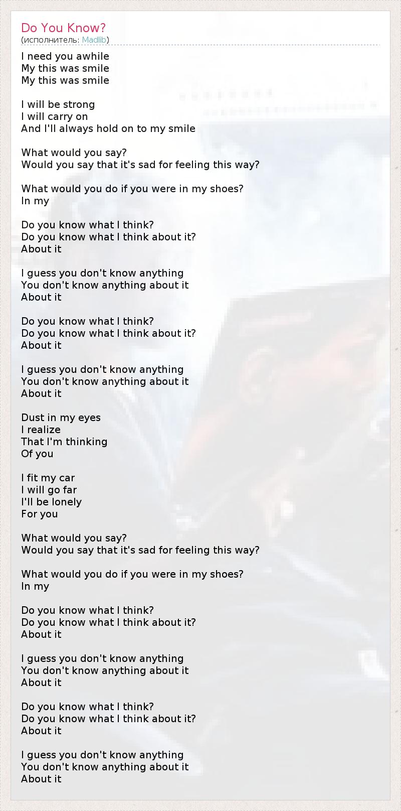 Ты мне нужен, но ненадолго... Я улыбалась, Я улыбалась. Я буду сильной, Я буду идти дальше... И я всегда буду улыбаться... Что бы ты сказал? Ты бы сказал, что грустно испытывать такое? Что бы ты сделал на моем месте? На моем.... Ты знаешь, что я думаю? Ты знаешь, что я думаю об этом? Об этом.... Думаю, ты ничего не знаешь, Ты ничего не знаешь об этом... Об этом.... Ты знаешь, что я думаю? Ты знаешь, что я думаю об этом? Об этом.... Думаю, ты ничего не знаешь, Ты ничего не знаешь об этом, Об этом... Пелена перед глазами - И я понимаю, Что думаю О тебе... Я завожу машину, Чтобы уехать далеко-далеко... Я буду одинока Из-за тебя.... Что бы ты сказал? Ты бы сказал, что грустно испытывать такое? Что бы ты сделал на моем месте? На моем.... Ты знаешь, что я думаю? Ты знаешь, что я думаю об этом? Об этом.... Думаю, ты ничего не знаешь, Ты ничего не знаешь об этом... Об этом.... Ты знаешь, что я думаю? Ты знаешь, что я думаю об этом? Об этом.... Думаю, ты ничего не знаешь, Ты ничего не знаешь об этом, Об этом...