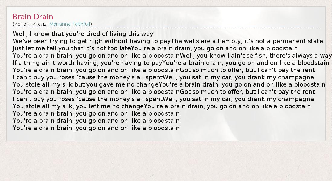 You stole all my silk, you left me no changeYou're a brain drain, you go on and on like a bloodstain