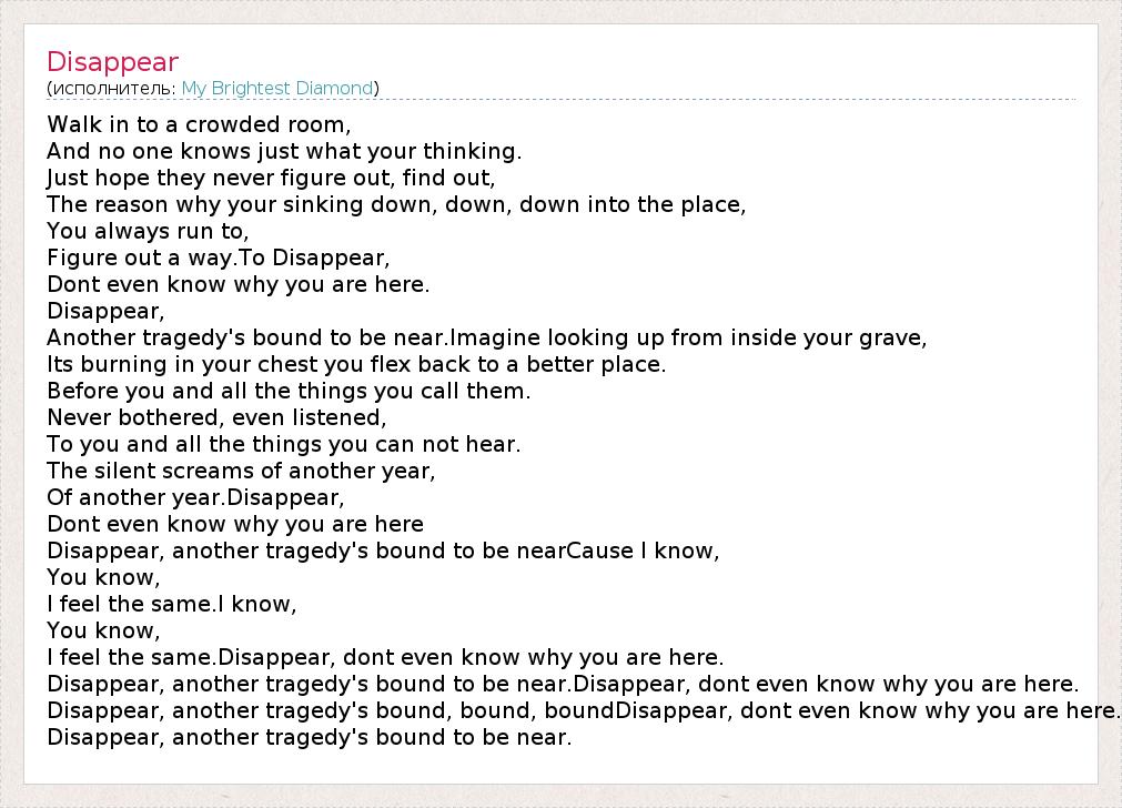Disappear, another tragedy's bound to be near.Disappear, dont even know why you are here.