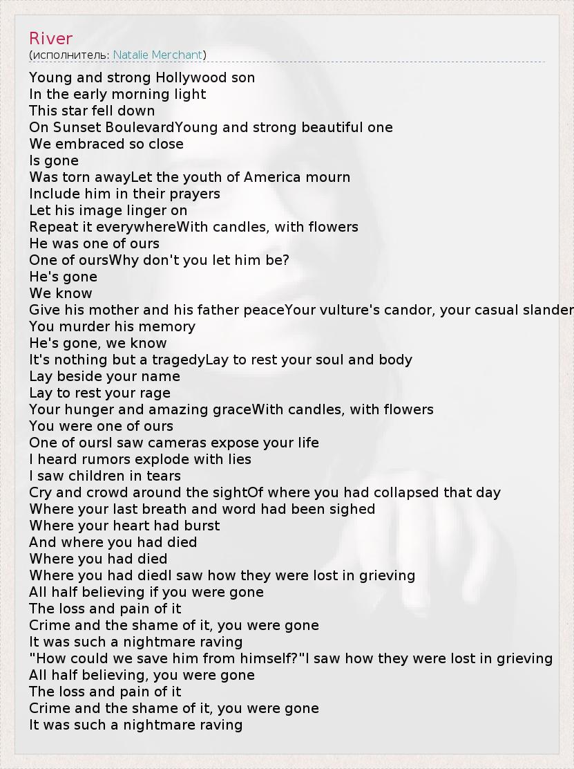 Young and strong Hollywood son In the early morning light This star fell down On Sunset BoulevardYoung and strong beautiful one We embraced so close Is gone Was torn awayLet the youth of America mourn Include him in their prayers Let his image linger on Repeat it everywhereWith candles, with flowers He was one of ours One of oursWhy don't you let him be? He's gone We know Give his mother and his father peaceYour vulture's candor, your casual slander You murder his memory He's gone, we know It's nothing but a tragedyLay to rest your soul and body Lay beside your name Lay to rest your rage Your hunger and amazing graceWith candles, with flowers You were one of ours One of oursI saw cameras expose your life I heard rumors explode with lies I saw children in tears Cry and crowd around the sightOf where you had collapsed that day Where your last breath and word had been sighed Where your heart had burst And where you had died Where you had died Where you had diedI saw how they were lost in grieving All half believing if you were gone The loss and pain of it Crime and the shame of it, you were gone It was such a nightmare raving "How could we save him from himself?"I saw how they were lost in grieving All half believing, you were gone The loss and pain of it Crime and the shame of it, you were gone It was such a nightmare raving