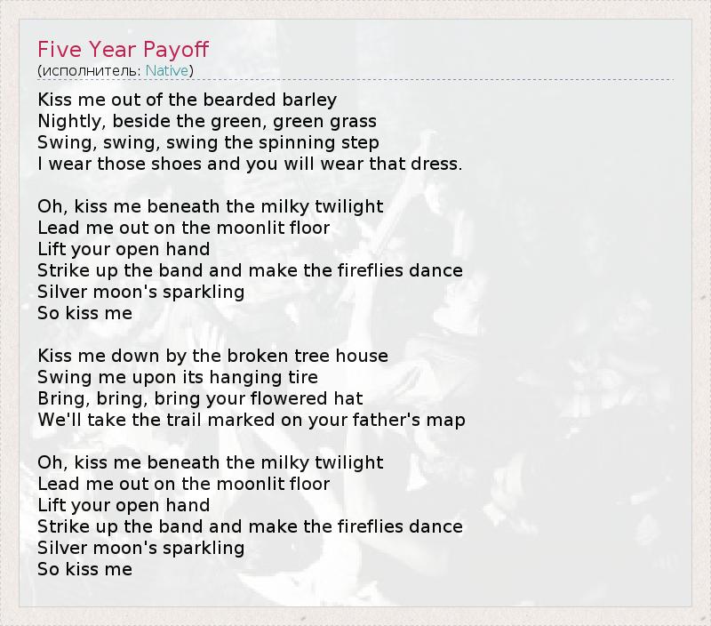Поцелуй меня из бородатого ячменя Ночные , рядом с зеленой , зеленой траве Качели, качели, качели шаг спиннинг Я ношу эти ботинки и вы будете носить это платье . О, поцелуй меня под молочно сумерках Выведи меня на лунную этаже Поднимите ладонь Завязать группу и сделать светлячки танцуют Игристое Серебряный Луны Так поцелуй меня Поцелуй меня прерывистой дерево дом Свинг меня на своей подвесной шины Принесите , принесите , принесите свой цветочек шляпу Мы возьмем след , обозначенную на карте вашего отца О, поцелуй меня под молочно сумерках Выведи меня на лунную этаже Поднимите ладонь Завязать группу и сделать светлячки танцуют Игристое Серебряный Луны Так поцелуй меня