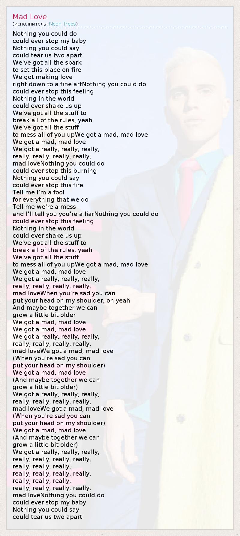 Nothing you could do could ever stop my baby Nothing you could say could tear us two apart We've got all the spark to set this place on fire We got making love right down to a fine artNothing you could do could ever stop this feeling Nothing in the world could ever shake us up We've got all the stuff to break all of the rules, yeah We've got all the stuff to mess all of you upWe got a mad, mad love We got a mad, mad love We got a really, really, really, really, really, really, really, mad loveNothing you could do could ever stop this burning Nothing you could say could ever stop this fire Tell me I'm a fool for everything that we do Tell me we're a mess and I'll tell you you're a liarNothing you could do could ever stop this feeling Nothing in the world could ever shake us up We've got all the stuff to break all of the rules, yeah We've got all the stuff to mess all of you upWe got a mad, mad love We got a mad, mad love We got a really, really, really, really, really, really, really, mad loveWhen you're sad you can put your head on my shoulder, oh yeah And maybe together we can grow a little bit older We got a mad, mad love We got a mad, mad love We got a really, really, really, really, really, really, really, mad loveWe got a mad, mad love (When you're sad you can put your head on my shoulder) We got a mad, mad love (And maybe together we can grow a little bit older) We got a really, really, really, really, really, really, really, mad loveWe got a mad, mad love (When you're sad you can put your head on my shoulder) We got a mad, mad love (And maybe together we can grow a little bit older) We got a really, really, really, really, really, really, really, really, really, really, really, really, really, really, really, really, really, really, really, really, really, mad loveNothing you could do could ever stop my baby Nothing you could say could tear us two apart