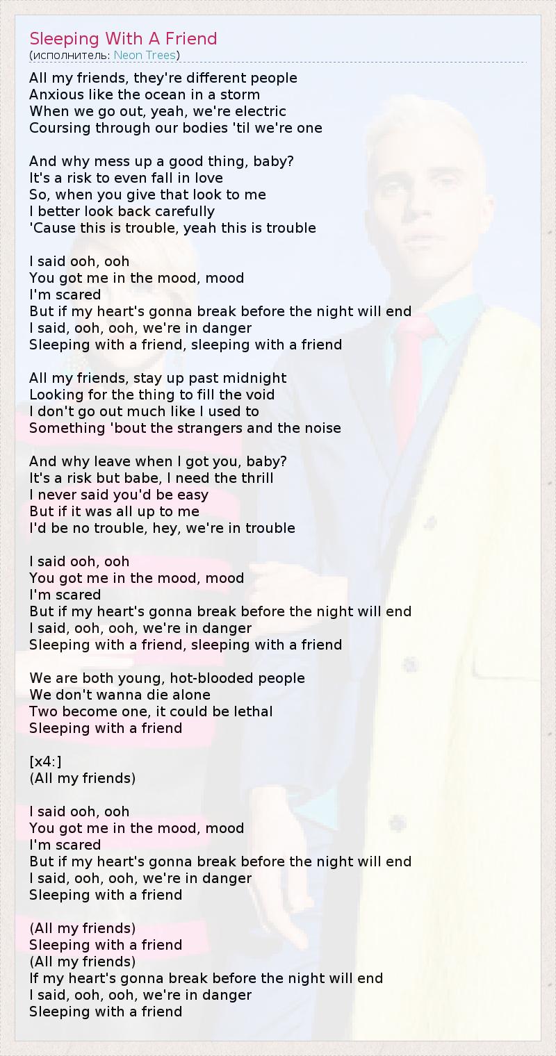 А как ты думаешь, о чем песня "Sleeping With A Friend" ?