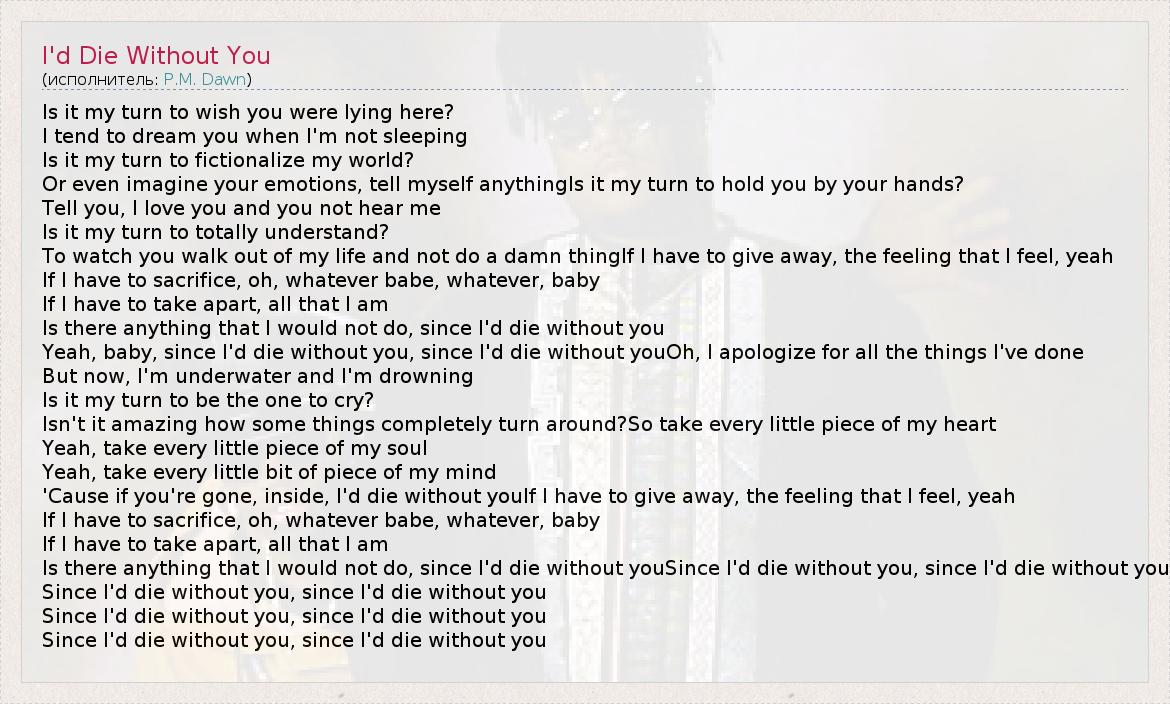 Is it my turn to wish you were lying here? I tend to dream you when I'm not sleeping Is it my turn to fictionalize my world? Or even imagine your emotions, tell myself anythingIs it my turn to hold you by your hands? Tell you, I love you and you not hear me Is it my turn to totally understand? To watch you walk out of my life and not do a damn thingIf I have to give away, the feeling that I feel, yeah If I have to sacrifice, oh, whatever babe, whatever, baby If I have to take apart, all that I am Is there anything that I would not do, since I'd die without you Yeah, baby, since I'd die without you, since I'd die without youOh, I apologize for all the things I've done But now, I'm underwater and I'm drowning Is it my turn to be the one to cry? Isn't it amazing how some things completely turn around?So take every little piece of my heart Yeah, take every little piece of my soul Yeah, take every little bit of piece of my mind 'Cause if you're gone, inside, I'd die without youIf I have to give away, the feeling that I feel, yeah If I have to sacrifice, oh, whatever babe, whatever, baby If I have to take apart, all that I am Is there anything that I would not do, since I'd die without youSince I'd die without you, since I'd die without you Since I'd die without you, since I'd die without you Since I'd die without you, since I'd die without you Since I'd die without you, since I'd die without you