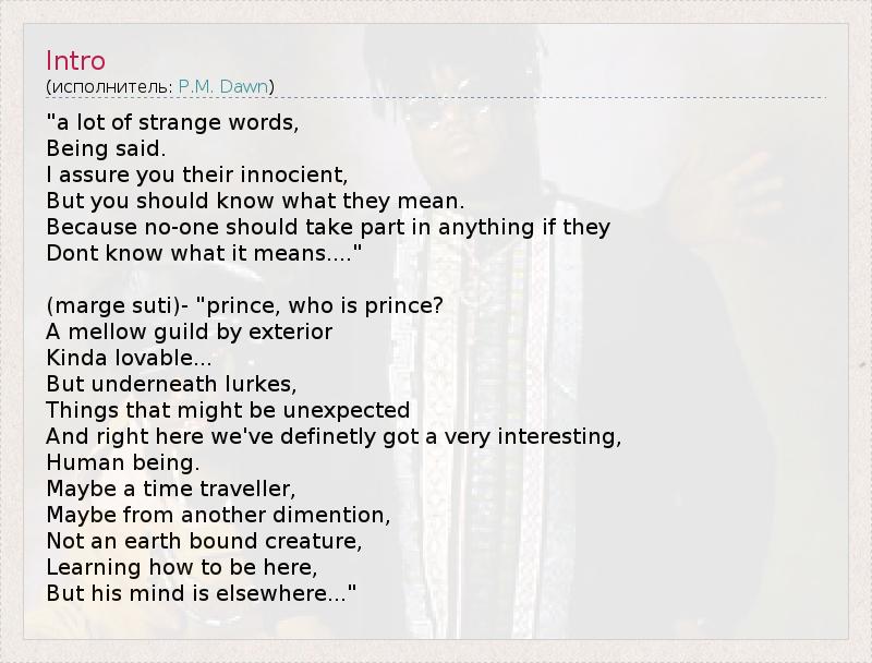"a lot of strange words, Being said. I assure you their innocient, But you should know what they mean. Because no-one should take part in anything if they Dont know what it means...." (marge suti)- "prince, who is prince? A mellow guild by exterior Kinda lovable... But underneath lurkes, Things that might be unexpected And right here we've definetly got a very interesting, Human being. Maybe a time traveller, Maybe from another dimention, Not an earth bound creature, Learning how to be here, But his mind is elsewhere..."