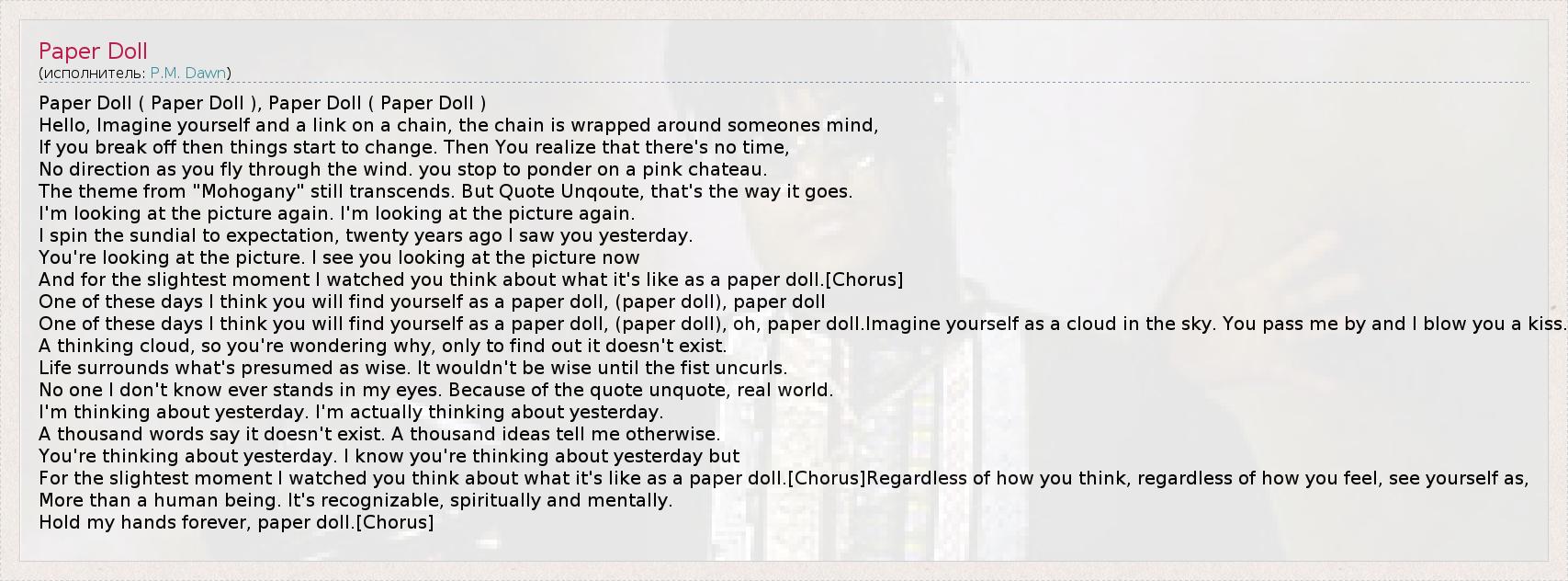 Paper Doll ( Paper Doll ), Paper Doll ( Paper Doll ) Hello, Imagine yourself and a link on a chain, the chain is wrapped around someones mind, If you break off then things start to change. Then You realize that there's no time, No direction as you fly through the wind. you stop to ponder on a pink chateau. The theme from "Mohogany" still transcends. But Quote Unqoute, that's the way it goes. I'm looking at the picture again. I'm looking at the picture again. I spin the sundial to expectation, twenty years ago I saw you yesterday. You're looking at the picture. I see you looking at the picture now And for the slightest moment I watched you think about what it's like as a paper doll.[Chorus] One of these days I think you will find yourself as a paper doll, (paper doll), paper doll One of these days I think you will find yourself as a paper doll, (paper doll), oh, paper doll.Imagine yourself as a cloud in the sky. You pass me by and I blow you a kiss. A thinking cloud, so you're wondering why, only to find out it doesn't exist. Life surrounds what's presumed as wise. It wouldn't be wise until the fist uncurls. No one I don't know ever stands in my eyes. Because of the quote unquote, real world. I'm thinking about yesterday. I'm actually thinking about yesterday. A thousand words say it doesn't exist. A thousand ideas tell me otherwise. You're thinking about yesterday. I know you're thinking about yesterday but For the slightest moment I watched you think about what it's like as a paper doll.[Chorus]Regardless of how you think, regardless of how you feel, see yourself as, More than a human being. It's recognizable, spiritually and mentally. Hold my hands forever, paper doll.[Chorus]