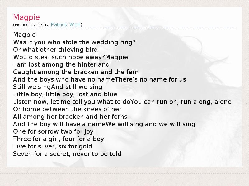 Magpie Was it you who stole the wedding ring? Or what other thieving bird Would steal such hope away?Magpie I am lost among the hinterland Caught among the bracken and the fern And the boys who have no nameThere's no name for us Still we singAnd still we sing Little boy, little boy, lost and blue Listen now, let me tell you what to doYou can run on, run along, alone Or home between the knees of her All among her bracken and her ferns And the boy will have a nameWe will sing and we will sing One for sorrow two for joy Three for a girl, four for a boy Five for silver, six for gold Seven for a secret, never to be told