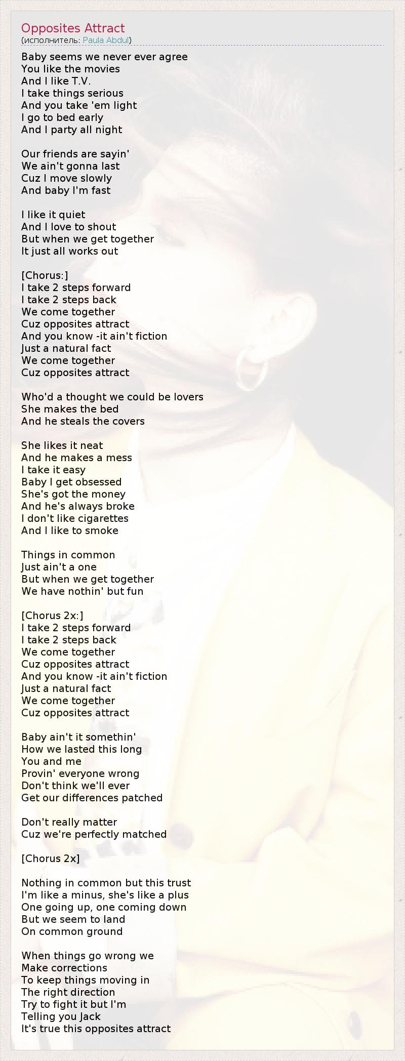 А как ты думаешь, о чем песня "Opposites Attract" ?
