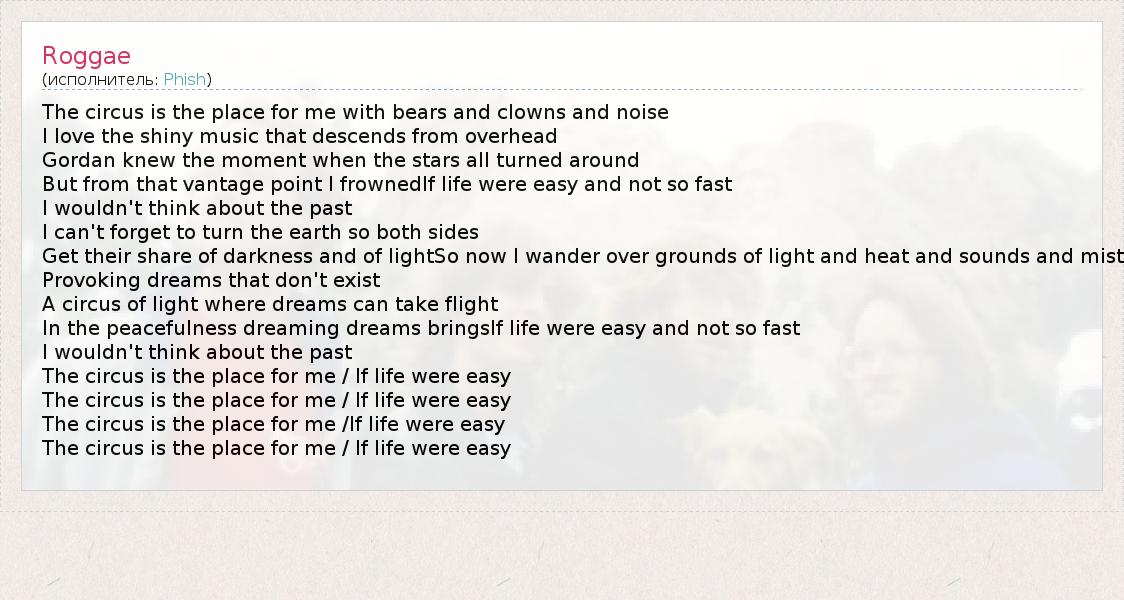 Это интересно:Phish — американская рок-группа, примечательная своими джем-сейшнами, импровизациями и постмодернистским смешением жанров. Phish была образована в 1983 году в университете Вермонта. Четыре ее участника выступали вместе 21 год, пока не распались в августе 2004 года. Их музыка содержала в себе элементы широкoго спектра жанров, и каждый их концерт был оригинальным в плане исполнения песен, порядка... продолжение
