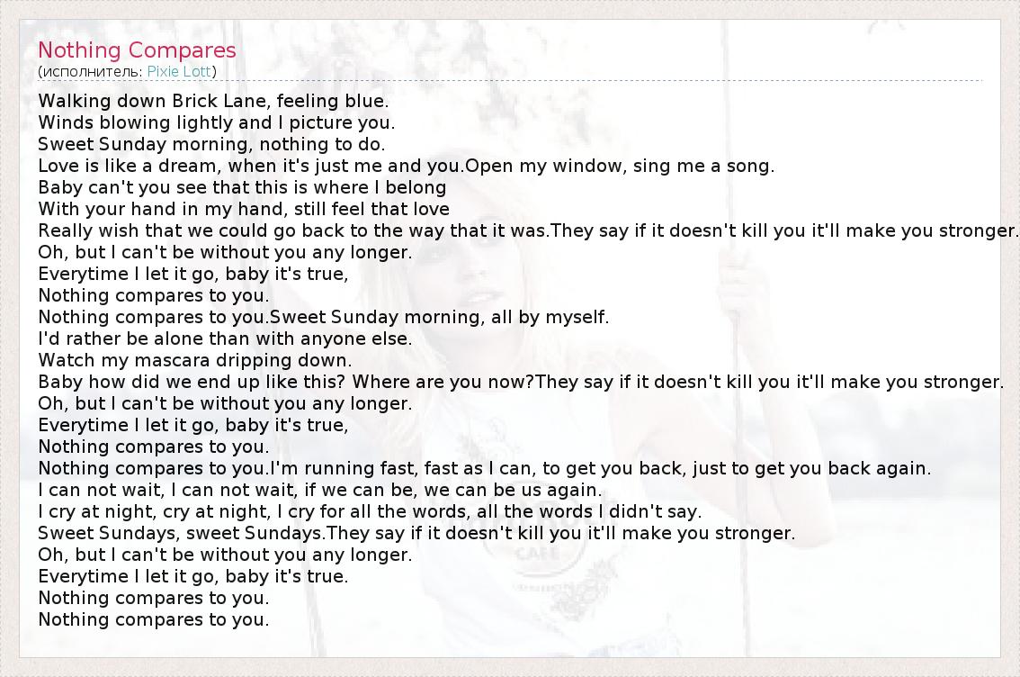 Walking down Brick Lane, feeling blue. Winds blowing lightly and I picture you. Sweet Sunday morning, nothing to do. Love is like a dream, when it's just me and you.Open my window, sing me a song. Baby can't you see that this is where I belong With your hand in my hand, still feel that love Really wish that we could go back to the way that it was.They say if it doesn't kill you it'll make you stronger. Oh, but I can't be without you any longer. Everytime I let it go, baby it's true, Nothing compares to you. Nothing compares to you.Sweet Sunday morning, all by myself. I'd rather be alone than with anyone else. Watch my mascara dripping down. Baby how did we end up like this? Where are you now?They say if it doesn't kill you it'll make you stronger. Oh, but I can't be without you any longer. Everytime I let it go, baby it's true, Nothing compares to you. Nothing compares to you.I'm running fast, fast as I can, to get you back, just to get you back again. I can not wait, I can not wait, if we can be, we can be us again. I cry at night, cry at night, I cry for all the words, all the words I didn't say. Sweet Sundays, sweet Sundays.They say if it doesn't kill you it'll make you stronger. Oh, but I can't be without you any longer. Everytime I let it go, baby it's true. Nothing compares to you. Nothing compares to you.