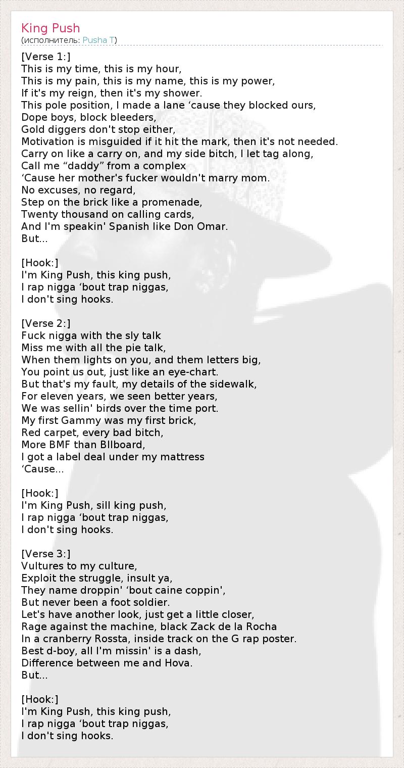 Это интересно:Pusha T (наст. имя Terrence Thornton) (родился 14 мая 1977) является основным рэппером Вирджиния-Бич и половиной хип-хоп дуэта Clipse. В сентябре 2010 года было объявлено о том, что он подписал контракт с лейблом Канье Уэста GOOD Music и 21 марта 2011 выпустил свой первый сольный микстейп, Fear of God.Родился в Бронксе, Нью-Йорк, но вскоре переехал в Норфолк, штат Вирджиния. В 1992 году Terrence и его брат Gene... продолжение