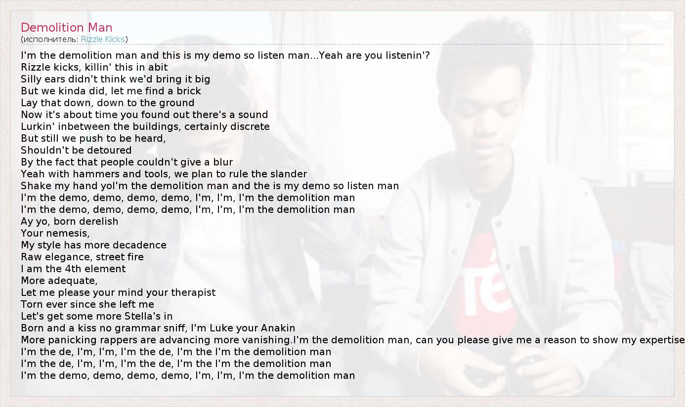 I'm the demolition man and this is my demo so listen man...Yeah are you listenin'? Rizzle kicks, killin' this in abit Silly ears didn't think we'd bring it big But we kinda did, let me find a brick Lay that down, down to the ground Now it's about time you found out there's a sound Lurkin' inbetween the buildings, certainly discrete But still we push to be heard, Shouldn't be detoured By the fact that people couldn't give a blur Yeah with hammers and tools, we plan to rule the slander Shake my hand yoI'm the demolition man and the is my demo so listen man I'm the demo, demo, demo, demo, I'm, I'm, I'm the demolition man I'm the demo, demo, demo, demo, I'm, I'm, I'm the demolition man Ay yo, born derelish Your nemesis, My style has more decadence Raw elegance, street fire I am the 4th element More adequate, Let me please your mind your therapist Torn ever since she left me Let's get some more Stella's in Born and a kiss no grammar sniff, I'm Luke your Anakin More panicking rappers are advancing more vanishing.I'm the demolition man, can you please give me a reason to show my expertise I'm the de, I'm, I'm, I'm the de, I'm the I'm the demolition man I'm the de, I'm, I'm, I'm the de, I'm the I'm the demolition man I'm the demo, demo, demo, demo, I'm, I'm, I'm the demolition man