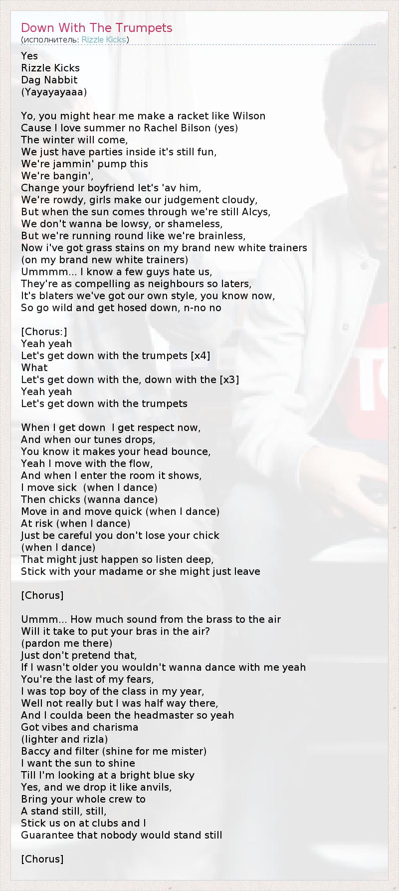Yes Rizzle Kicks Dag Nabbit (Yayayayaaa) Yo, you might hear me make a racket like Wilson Cause I love summer no Rachel Bilson (yes) The winter will come, We just have parties inside it's still fun, We're jammin' pump this We're bangin', Change your boyfriend let's 'av him, We're rowdy, girls make our judgement cloudy, But when the sun comes through we're still Аlcys, We don't wanna be lowsy, or shameless, But we're running round like we're brainless, Now i've got grass stains on my brand new white trainers (on my brand new white trainers) Ummmm... I know a few guys hate us, They're as compelling as neighbours so laters, It's blaters we've got our own style, you know now, So go wild and get hosed down, n-no no [Chorus:] Yeah yeah Let's get down with the trumpets [x4] What Let's get down with the, down with the [x3] Yeah yeah Let's get down with the trumpets When I get down I get respect now, And when our tunes drops, You know it makes your head bounce, Yeah I move with the flow, And when I enter the room it shows, I move sick (when I dance) Then chicks (wanna dance) Move in and move quick (when I dance) At risk (when I dance) Just be careful you don't lose your chick (when I dance) That might just happen so listen deep, Stick with your madame or she might just leave [Chorus] Ummm... How much sound from the brass to the air Will it take to put your bras in the air? (pardon me there) Just don't pretend that, If I wasn't older you wouldn't wanna dance with me yeah You're the last of my fears, I was top boy of the class in my year, Well not really but I was half way there, And I coulda been the headmaster so yeah Got vibes and charisma (lighter and rizla) Baccy and filter (shine for me mister) I want the sun to shine Till I'm looking at a bright blue sky Yes, and we drop it like anvils, Bring your whole crew to A stand still, still, Stick us on at clubs and I Guarantee that nobody would stand still [Chorus]