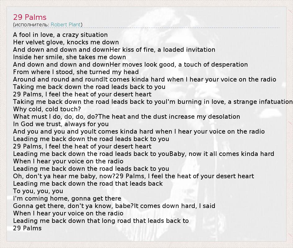 Oh, don't ya hear me baby, now?29 Palms, I feel the heat of your desert heart