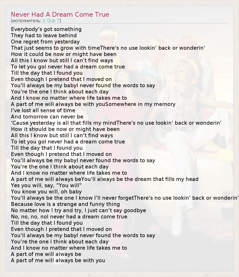ГлавнаяИсполнителиS Club 7Never Had A Dream Come True
