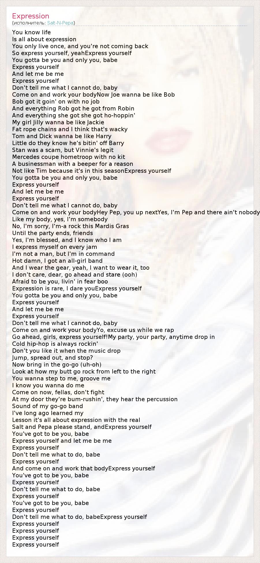 You know life Is all about expression You only live once, and you're not coming back So express yourself, yeahExpress yourself You gotta be you and only you, babe Express yourself And let me be me Express yourself Don't tell me what I cannot do, baby Come on and work your bodyNow Joe wanna be like Bob Bob got it goin' on with no job And everything Rob got he got from Robin And everything she got she got ho-hoppin' My girl Jilly wanna be like Jackie Fat rope chains and I think that's wacky Tom and Dick wanna be like Harry Little do they know he's bitin' off Barry Stan was a scam, but Vinnie's legit Mercedes coupe hometroop with no kit A businessman with a beeper for a reason Not like Tim because it's in this seasonExpress yourself You gotta be you and only you, babe Express yourself And let me be me Express yourself Don't tell me what I cannot do, baby Come on and work your bodyHey Pep, you up nextYes, I'm Pep and there ain't nobody Like my body, yes, I'm somebody No, I'm sorry, I'm-a rock this Mardis Gras Until the party ends, friends Yes, I'm blessed, and I know who I am I express myself on every jam I'm not a man, but I'm in command Hot damn, I got an all-girl band And I wear the gear, yeah, I want to wear it, too I don't care, dear, go ahead and stare (ooh) Afraid to be you, livin' in fear boo Expression is rare, I dare youExpress yourself You gotta be you and only you, babe Express yourself And let me be me Express yourself Don't tell me what I cannot do, baby Come on and work your bodyYo, excuse us while we rap Go ahead, girls, express yourself!My party, your party, anytime drop in Cold hip-hop is always rockin' Don't you like it when the music drop Jump, spread out, and stop? Now bring in the go-go (uh-oh) Look at how my butt go rock from left to the right You wanna step to me, groove me I know you wanna do me Come on now, fellas, don't fight At my door they're bum-rushin', they hear the percussion Sound of my go-go band I've long ago learned my Lesson it's all about expression with the real Salt and Pepa please stand, andExpress yourself You've got to be you, babe Express yourself and let me be me Express yourself Don't tell me what to do, babe Express yourself And come on and work that bodyExpress yourself You've got to be you, babe Express yourself Don't tell me what to do, babe Express yourself You've got to be you, babe Express yourself Don't tell me what to do, babeExpress yourself Express yourself Express yourself Express yourself Express yourself