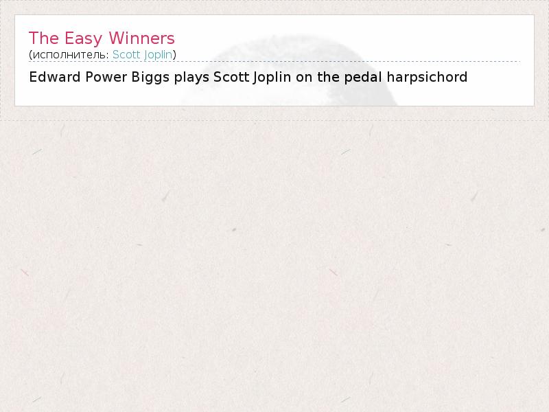Это интересно:Скотт Джо́плин (англ. Scott Joplin; 24 ноября 1868 года, Северный Техас — 1 апреля 1917 года, Нью-Йорк) — афроамериканский композитор и пианист, автор 44 регтаймов, наиболее известный из которых — «Артист эстрады (англ.)русск.» (англ. «The Entertainer»). Считается крупнейшим автором рэгтаймов, однако признание получил лишь после смерти. При жизни его музыка воспринималась афроамериканской общиной как «слишком... продолжение
