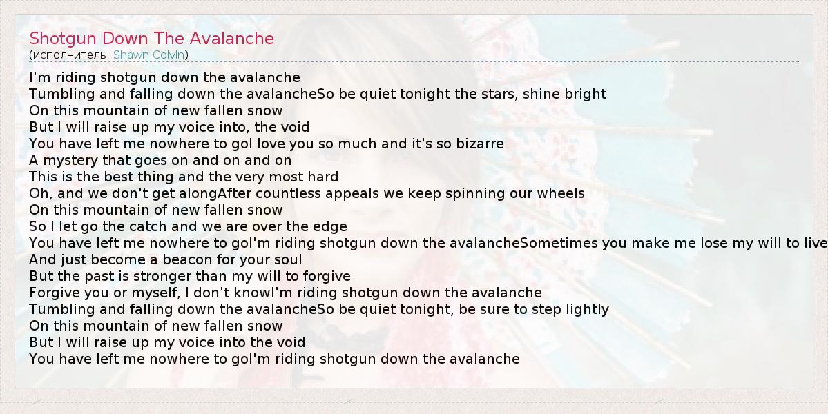ГлавнаяИсполнителиShawn ColvinShotgun Down The Avalanche