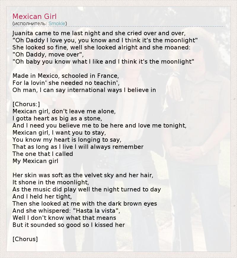Juanita came to me last night and she cried over and over, "Oh Daddy I love you, you know and I think it's the moonlight" She looked so fine, well she looked alright and she moaned: "Oh Daddy, move over", "Oh baby you know what I like and I think it's the moonlight" Made in Mexico, schooled in France, For la lovin' she needed no teachin', Oh man, I can say international ways I believe in [Chorus:] Mexican girl, don't leave me alone, I gotta heart as big as a stone, And I need you believe me to be here and love me tonight, Mexican girl, I want you to stay, You know my heart is longing to say, That as long as I live I will always remember The one that I called My Mexican girl Her skin was soft as the velvet sky and her hair, It shone in the moonlight, As the music did play well the night turned to day And I held her tight, Then she looked at me with the dark brown eyes And she whispered: "Hasta la vista", Well I don't know what that means But it sounded so good so I kissed her [Chorus]