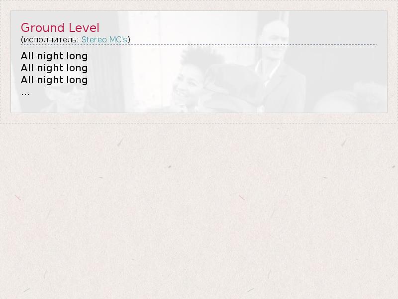 Это интересно:Патриархи британского хип-хопа Stereo MC's, отмечающие в 2005 году двадцатилетний юбилей, испытали на прочность череду самых разных стилей. Они делали электронную музыку, хаус, эйсид-джаз, танцевальные композиции, трип-хоп и рэп. Редкие группы способны переварить такое разнообразное меню. В карьере Stereo MC's были периоды более или менее успешные, был период почти полного затишья: на восемь... продолжение