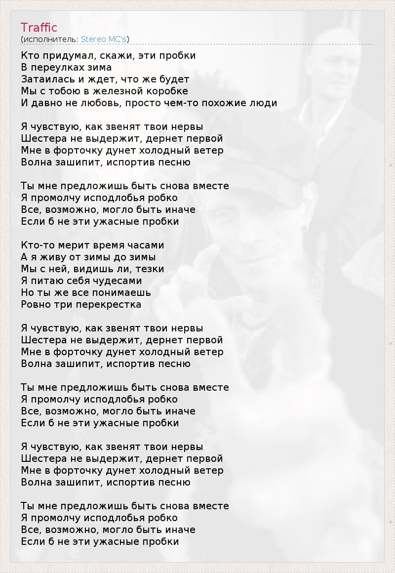 Кто придумал, скажи, эти пробки В переулках зима Затаилась и ждет, что же будет Мы с тобою в железной коробке И давно не любовь, просто чем-то похожие люди Я чувствую, как звенят твои нервы Шестера не выдержит, дернет первой Мне в форточку дунет холодный ветер Волна зашипит, испортив песню Ты мне предложишь быть снова вместе Я промолчу исподлобья робко Все, возможно, могло быть иначе Если б не эти ужасные пробки Кто-то мерит время часами А я живу от зимы до зимы Мы с ней, видишь ли, тезки Я питаю себя чудесами Но ты же все понимаешь Ровно три перекрестка Я чувствую, как звенят твои нервы Шестера не выдержит, дернет первой Мне в форточку дунет холодный ветер Волна зашипит, испортив песню Ты мне предложишь быть снова вместе Я промолчу исподлобья робко Все, возможно, могло быть иначе Если б не эти ужасные пробки Я чувствую, как звенят твои нервы Шестера не выдержит, дернет первой Мне в форточку дунет холодный ветер Волна зашипит, испортив песню Ты мне предложишь быть снова вместе Я промолчу исподлобья робко Все, возможно, могло быть иначе Если б не эти ужасные пробки