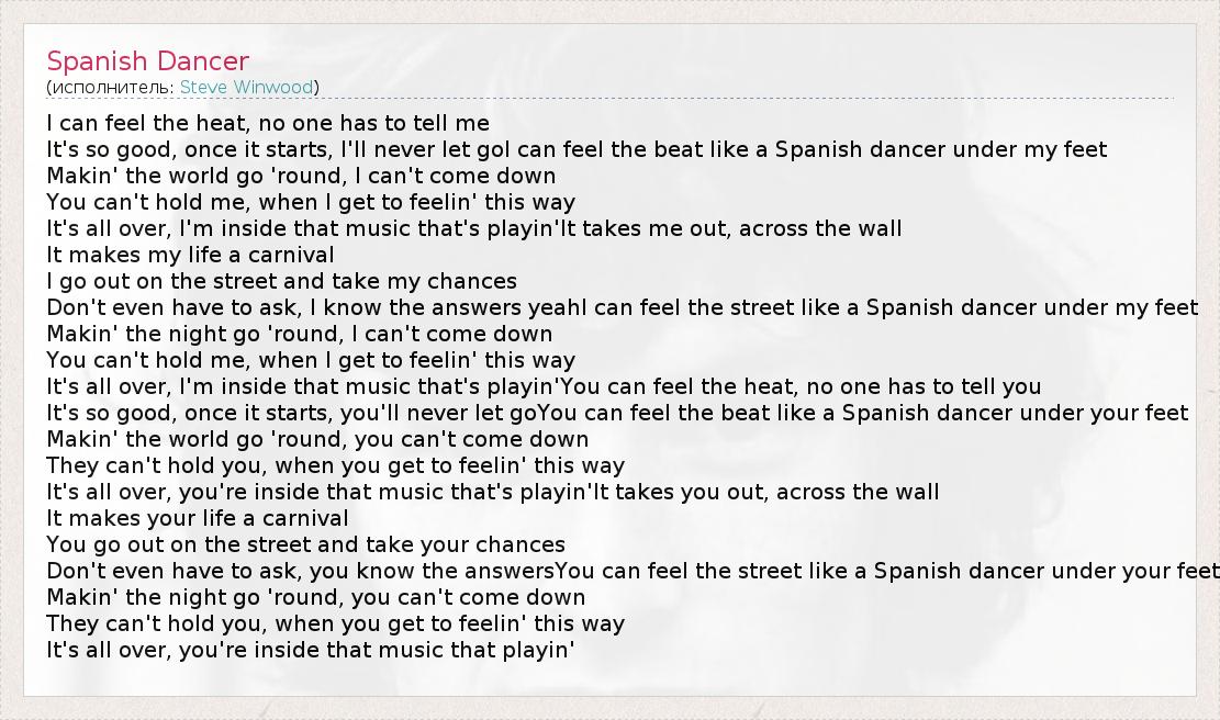 I can feel the heat, no one has to tell me It's so good, once it starts, I'll never let goI can feel the beat like a Spanish dancer under my feet Makin' the world go 'round, I can't come down You can't hold me, when I get to feelin' this way It's all over, I'm inside that music that's playin'It takes me out, across the wall It makes my life a carnival I go out on the street and take my chances Don't even have to ask, I know the answers yeahI can feel the street like a Spanish dancer under my feet Makin' the night go 'round, I can't come down You can't hold me, when I get to feelin' this way It's all over, I'm inside that music that's playin'You can feel the heat, no one has to tell you It's so good, once it starts, you'll never let goYou can feel the beat like a Spanish dancer under your feet Makin' the world go 'round, you can't come down They can't hold you, when you get to feelin' this way It's all over, you're inside that music that's playin'It takes you out, across the wall It makes your life a carnival You go out on the street and take your chances Don't even have to ask, you know the answersYou can feel the street like a Spanish dancer under your feet Makin' the night go 'round, you can't come down They can't hold you, when you get to feelin' this way It's all over, you're inside that music that playin'