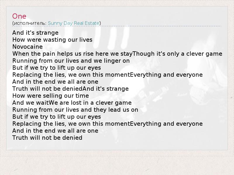 Это интересно:Sunny Day Real Estate (или SDRE) (с англ. Собственность солнечного дня) — американская альтернативная рок-группа из города Сиэттл, штат Вашингтон. Группа образовалась в 1992 году под первоначальным названием «Empty Set» и включала в себя Дэна Хэрнера (гитара, вокал), Нэйта Мэндела (бас) и Уильяма Голдсмита (барабаны).Ребята записали демо под этим названием, но тут вдруг обнаружилось,... продолжение