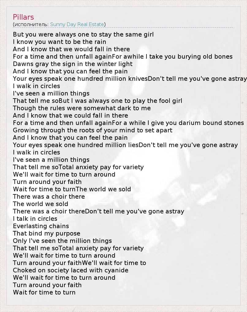 But you were always one to stay the same girl I know you want to be the rain And I know that we would fall in there For a time and then unfall againFor awhile I take you burying old bones Dawns gray the sign in the winter light And I know that you can feel the pain Your eyes speak one hundred million knivesDon't tell me you've gone astray I walk in circles I've seen a million things That tell me soBut I was always one to play the fool girl Though the rules were somewhat dark to me And I know that we could fall in there For a time and then unfall againFor a while I give you darium bound stones Growing through the roots of your mind to set apart And I know that you can feel the pain Your eyes speak one hundred million liesDon't tell me you've gone astray I walk in circles I've seen a million things That tell me soTotal anxiety pay for variety We'll wait for time to turn around Turn around your faith Wait for time to turnThe world we sold There was a choir there The world we sold There was a choir thereDon't tell me you've gone astray I talk in circles Everlasting chains That bind my purpose Only I've seen the million things That tell me soTotal anxiety pay for variety We'll wait for time to turn around Turn around your faithWe'll wait for time to Choked on society laced with cyanide We'll wait for time to turn around Turn around your faith Wait for time to turn