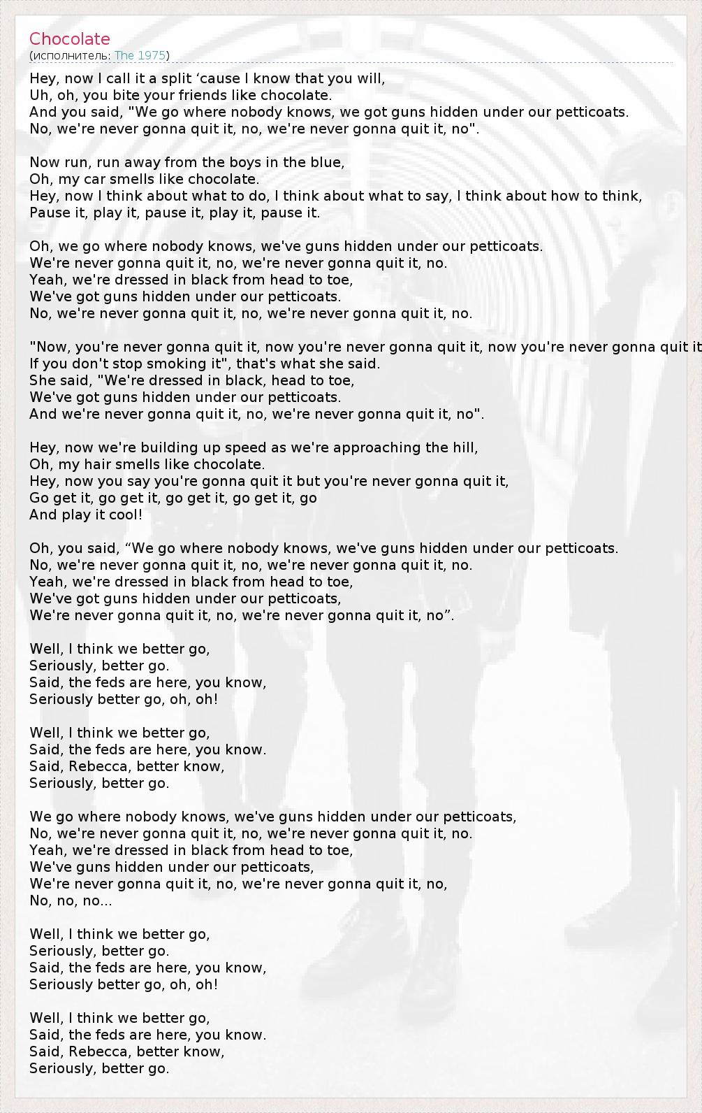 Это интересно:Обласканные вниманием британских музыкальных СМИ новички из Манчестера The 1975 – одно из самых интересных свежих лиц местной инди-сцены. “Sex”, исполненный в лучших традициях шугейза далеких 90-х, пропитан нетерпеливыми вокальными партиями и ярким синтезаторным звучанием при поддержке индастриал-ритмики. Они записали четыре ЕР перед тем как выпустить свой дебютный альбом. The 1975 был выпущен... продолжение