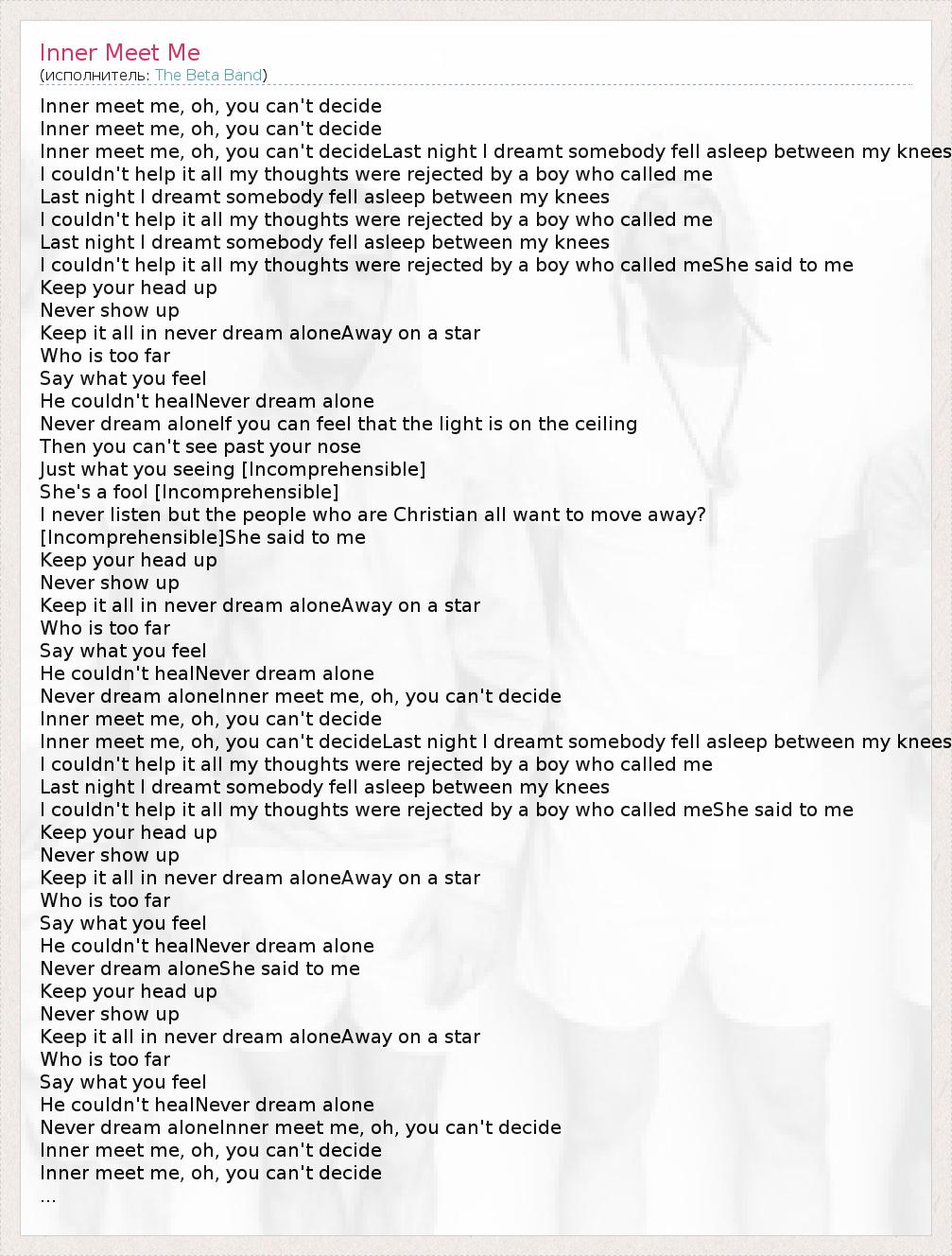 Inner meet me, oh, you can't decideLast night I dreamt somebody fell asleep between my knees
