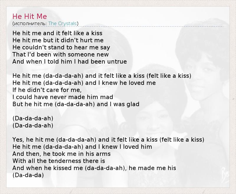 He hit me and it felt like a kiss He hit me but it didn't hurt me He couldn't stand to hear me say That I'd been with someone new And when I told him I had been untrue He hit me (da-da-da-ah) and it felt like a kiss (felt like a kiss) He hit me (da-da-da-ah) and I knew he loved me If he didn't care for me, I could have never made him mad But he hit me (da-da-da-ah) and I was glad (Da-da-da-ah) (Da-da-da-ah) Yes, he hit me (da-da-da-ah) and it felt like a kiss (felt like a kiss) He hit me (da-da-da-ah) and I knew I loved him And then, he took me in his arms With all the tenderness there is And when he kissed me (da-da-da-ah), he made me his (Da-da-da)