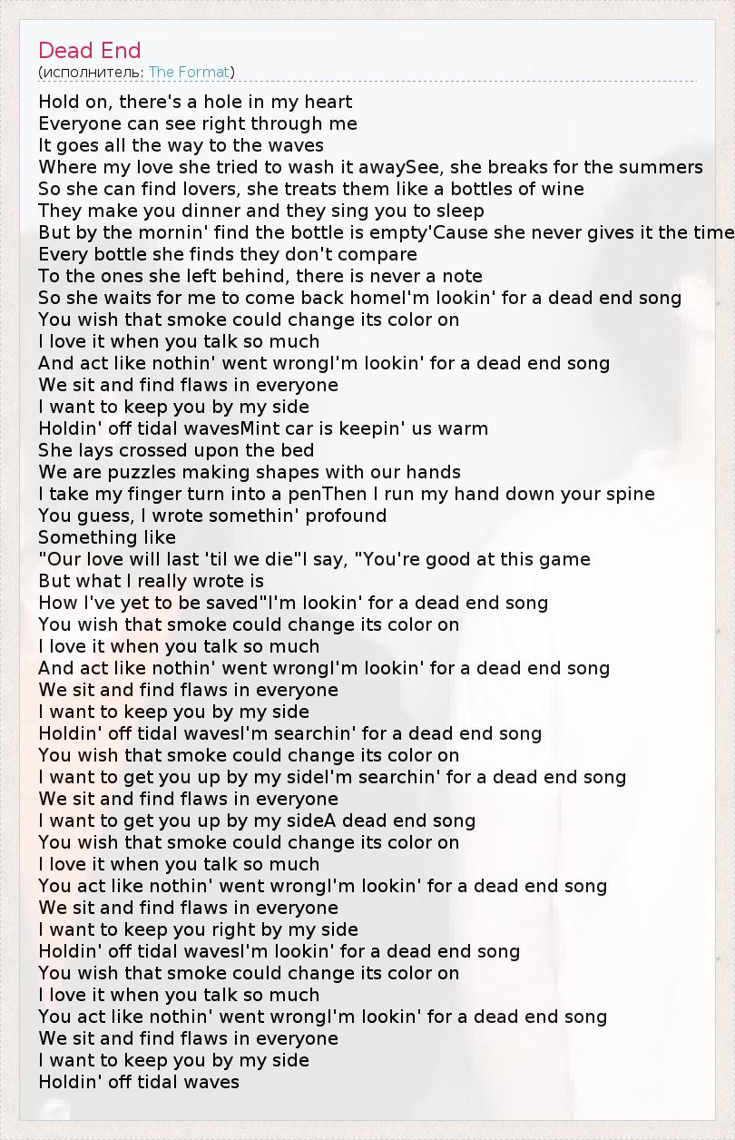 Holdin' off tidal wavesI'm lookin' for a dead end song