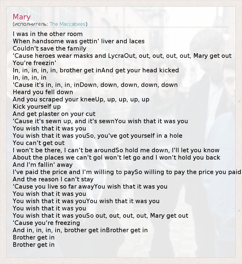 'Cause heroes wear masks and LycraOut, out, out, out, out, Mary get out