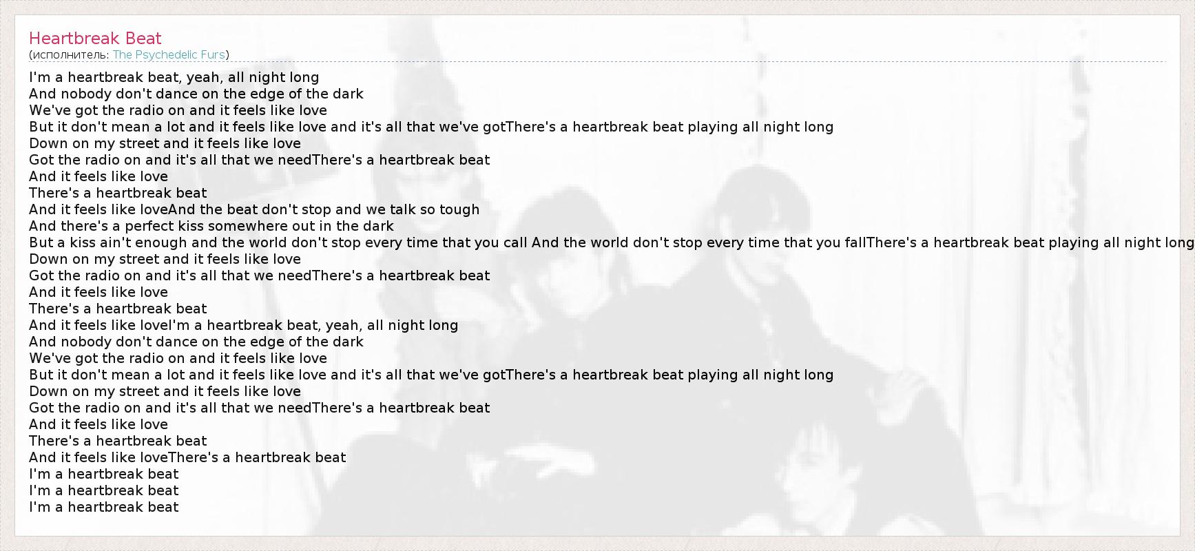 I'm a heartbreak beat, yeah, all night long And nobody don't dance on the edge of the dark We've got the radio on and it feels like love But it don't mean a lot and it feels like love and it's all that we've gotThere's a heartbreak beat playing all night long Down on my street and it feels like love Got the radio on and it's all that we needThere's a heartbreak beat And it feels like love There's a heartbreak beat And it feels like loveAnd the beat don't stop and we talk so tough And there's a perfect kiss somewhere out in the dark But a kiss ain't enough and the world don't stop every time that you call And the world don't stop every time that you fallThere's a heartbreak beat playing all night long Down on my street and it feels like love Got the radio on and it's all that we needThere's a heartbreak beat And it feels like love There's a heartbreak beat And it feels like loveI'm a heartbreak beat, yeah, all night long And nobody don't dance on the edge of the dark We've got the radio on and it feels like love But it don't mean a lot and it feels like love and it's all that we've gotThere's a heartbreak beat playing all night long Down on my street and it feels like love Got the radio on and it's all that we needThere's a heartbreak beat And it feels like love There's a heartbreak beat And it feels like loveThere's a heartbreak beat I'm a heartbreak beat I'm a heartbreak beat I'm a heartbreak beat