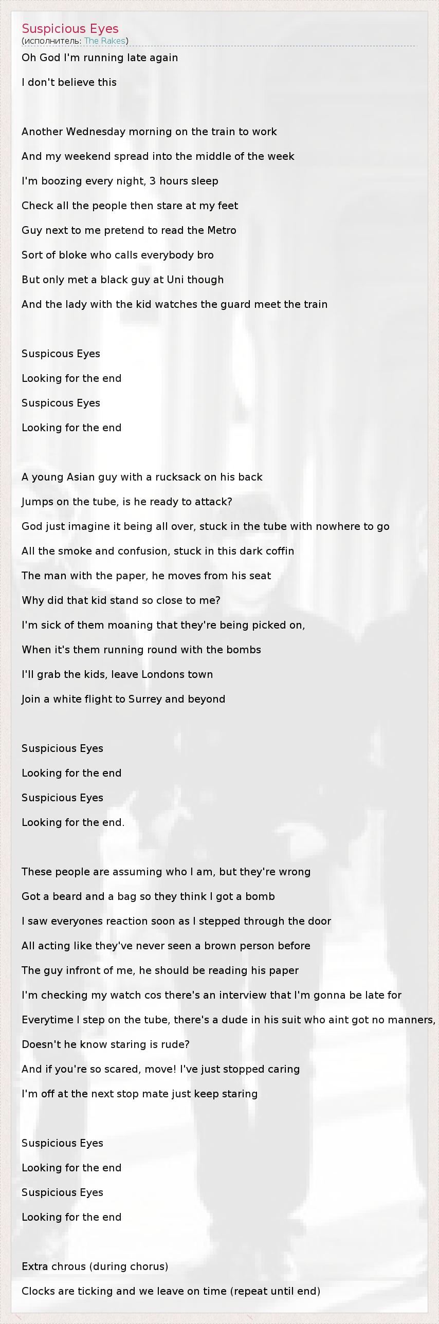 А как ты думаешь, о чем песня "Suspicious Eyes" ?