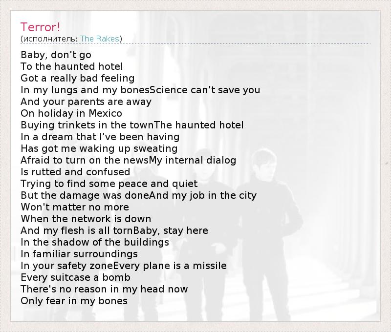 Baby, don't go To the haunted hotel Got a really bad feeling In my lungs and my bonesScience can't save you And your parents are away On holiday in Mexico Buying trinkets in the townThe haunted hotel In a dream that I've been having Has got me waking up sweating Afraid to turn on the newsMy internal dialog Is rutted and confused Trying to find some peace and quiet But the damage was doneAnd my job in the city Won't matter no more When the network is down And my flesh is all tornBaby, stay here In the shadow of the buildings In familiar surroundings In your safety zoneEvery plane is a missile Every suitcase a bomb There's no reason in my head now Only fear in my bones