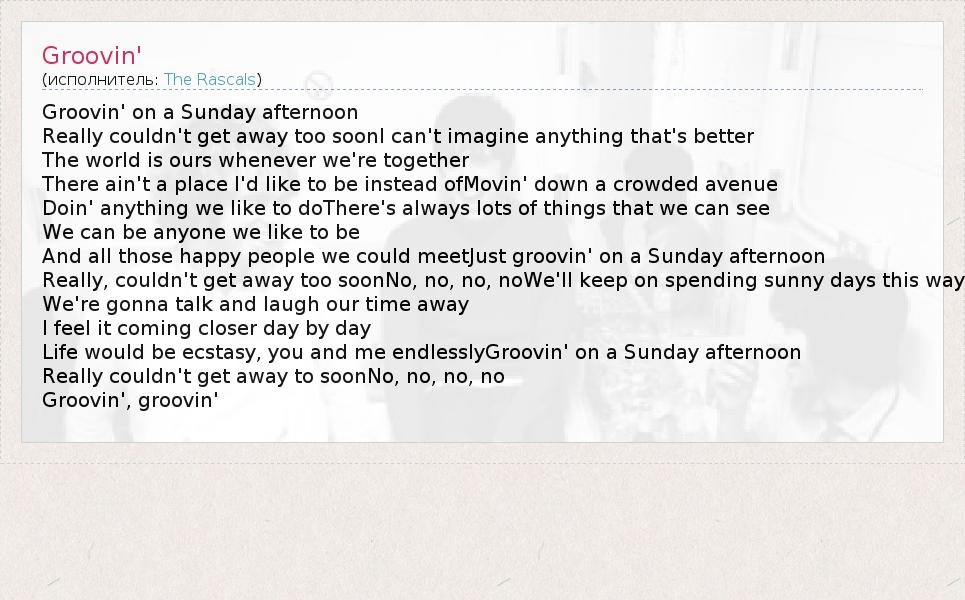And all those happy people we could meetJust groovin' on a Sunday afternoon