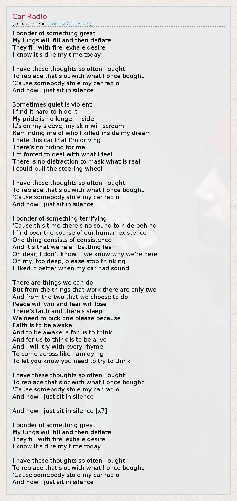I ponder of something great My lungs will fill and then deflate They fill with fire, exhale desire I know it's dire my time today I have these thoughts so often I ought To replace that slot with what I once bought 'Cause somebody stole my car radio And now I just sit in silence Sometimes quiet is violent I find it hard to hide it My pride is no longer inside It's on my sleeve, my skin will scream Reminding me of who I killed inside my dream I hate this car that I'm driving There's no hiding for me I'm forced to deal with what I feel There is no distraction to mask what is real I could pull the steering wheel I have these thoughts so often I ought To replace that slot with what I once bought 'Cause somebody stole my car radio And now I just sit in silence I ponder of something terrifying 'Cause this time there's no sound to hide behind I find over the course of our human existence One thing consists of consistence And it's that we're all battling fear Oh dear, I don't know if we know why we're here Oh my, too deep, please stop thinking I liked it better when my car had sound There are things we can do But from the things that work there are only two And from the two that we choose to do Peace will win and fear will lose There's faith and there's sleep We need to pick one please because Faith is to be awake And to be awake is for us to think And for us to think is to be alive And I will try with every rhyme To come across like I am dying To let you know you need to try to think I have these thoughts so often I ought To replace that slot with what I once bought 'Cause somebody stole my car radio And now I just sit in silence And now I just sit in silence [x7] I ponder of something great My lungs will fill and then deflate They fill with fire, exhale desire I know it's dire my time today I have these thoughts so often I ought To replace that slot with what I once bought 'Cause somebody stole my car radio And now I just sit in silence