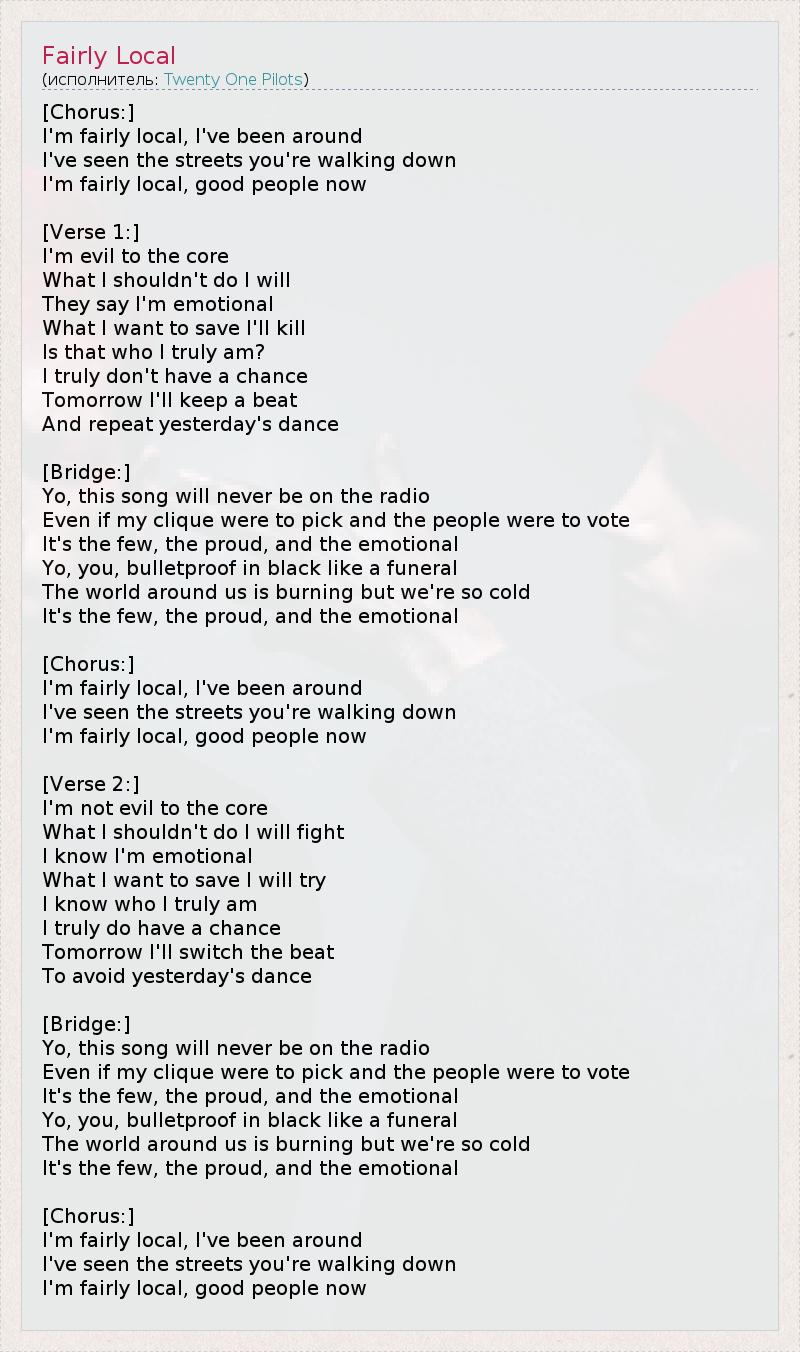 [Chorus:] I'm fairly local, I've been around I've seen the streets you're walking down I'm fairly local, good people now [Verse 1:] I'm evil to the core What I shouldn't do I will They say I'm emotional What I want to save I'll kill Is that who I truly am? I truly don't have a chance Tomorrow I'll keep a beat And repeat yesterday's dance [Bridge:] Yo, this song will never be on the radio Even if my clique were to pick and the people were to vote It's the few, the proud, and the emotional Yo, you, bulletproof in black like a funeral The world around us is burning but we're so cold It's the few, the proud, and the emotional [Chorus:] I'm fairly local, I've been around I've seen the streets you're walking down I'm fairly local, good people now [Verse 2:] I'm not evil to the core What I shouldn't do I will fight I know I'm emotional What I want to save I will try I know who I truly am I truly do have a chance Tomorrow I'll switch the beat To avoid yesterday's dance [Bridge:] Yo, this song will never be on the radio Even if my clique were to pick and the people were to vote It's the few, the proud, and the emotional Yo, you, bulletproof in black like a funeral The world around us is burning but we're so cold It's the few, the proud, and the emotional [Chorus:] I'm fairly local, I've been around I've seen the streets you're walking down I'm fairly local, good people now