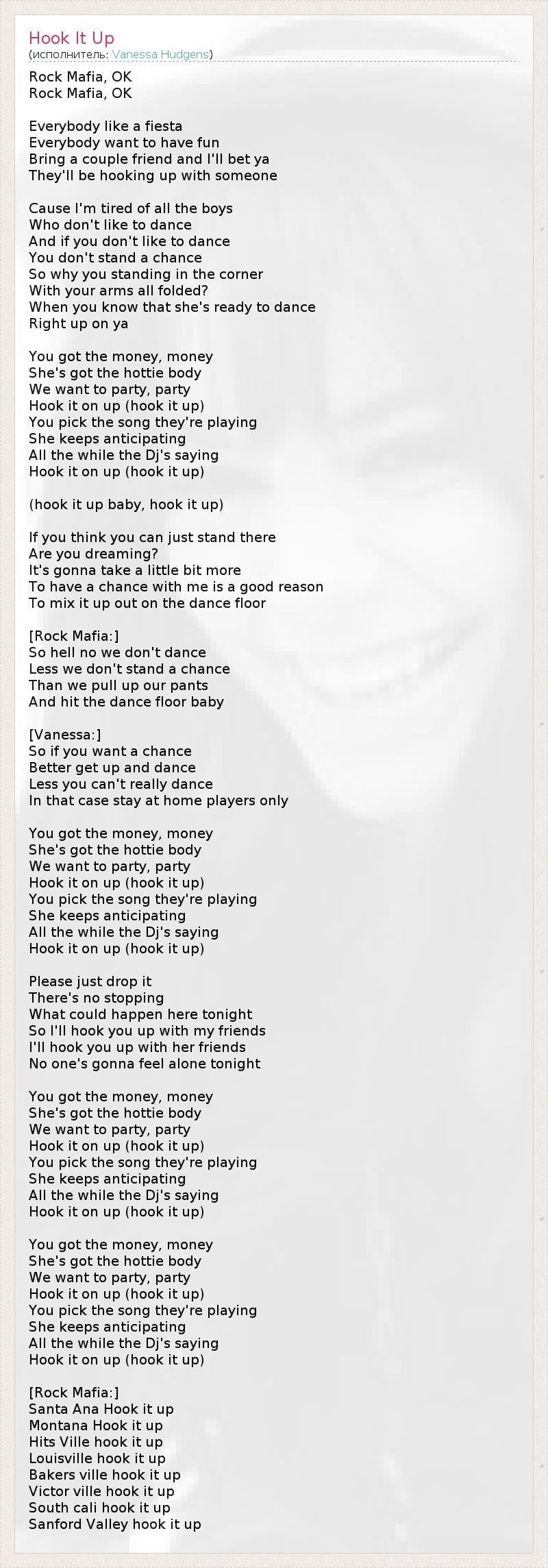 Rock Mafia, OK Rock Mafia, OK Everybody like a fiesta Everybody want to have fun Bring a couple friend and I'll bet ya They'll be hooking up with someone Cause I'm tired of all the boys Who don't like to dance And if you don't like to dance You don't stand a chance So why you standing in the corner With your arms all folded? When you know that she's ready to dance Right up on ya You got the money, money She's got the hottie body We want to party, party Hook it on up (hook it up) You pick the song they're playing She keeps anticipating All the while the Dj's saying Hook it on up (hook it up) (hook it up baby, hook it up) If you think you can just stand there Are you dreaming? It's gonna take a little bit more To have a chance with me is a good reason To mix it up out on the dance floor [Rock Mafia:] So hell no we don't dance Less we don't stand a chance Than we pull up our pants And hit the dance floor baby [Vanessa:] So if you want a chance Better get up and dance Less you can't really dance In that case stay at home players only You got the money, money She's got the hottie body We want to party, party Hook it on up (hook it up) You pick the song they're playing She keeps anticipating All the while the Dj's saying Hook it on up (hook it up) Please just drop it There's no stopping What could happen here tonight So I'll hook you up with my friends I'll hook you up with her friends No one's gonna feel alone tonight You got the money, money She's got the hottie body We want to party, party Hook it on up (hook it up) You pick the song they're playing She keeps anticipating All the while the Dj's saying Hook it on up (hook it up) You got the money, money She's got the hottie body We want to party, party Hook it on up (hook it up) You pick the song they're playing She keeps anticipating All the while the Dj's saying Hook it on up (hook it up) [Rock Mafia:] Santa Ana Hook it up Montana Hook it up Hits Ville hook it up Louisville hook it up Bakers ville hook it up Victor ville hook it up South cali hook it up Sanford Valley hook it up