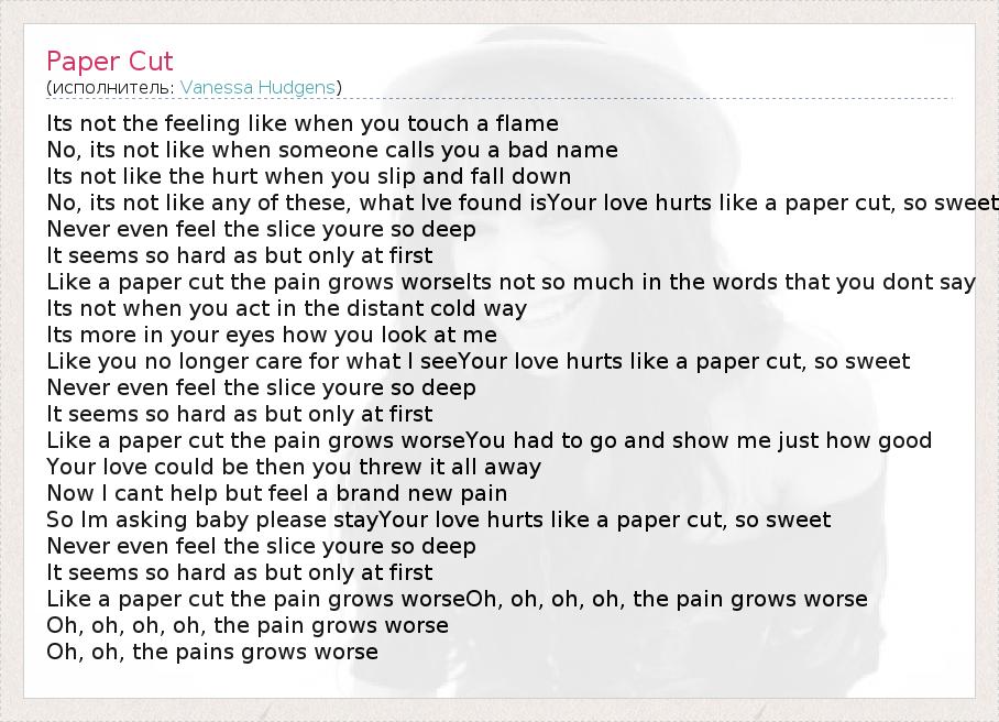 Its not the feeling like when you touch a flame No, its not like when someone calls you a bad name Its not like the hurt when you slip and fall down No, its not like any of these, what Ive found isYour love hurts like a paper cut, so sweet Never even feel the slice youre so deep It seems so hard as but only at first Like a paper cut the pain grows worseIts not so much in the words that you dont say Its not when you act in the distant cold way Its more in your eyes how you look at me Like you no longer care for what I seeYour love hurts like a paper cut, so sweet Never even feel the slice youre so deep It seems so hard as but only at first Like a paper cut the pain grows worseYou had to go and show me just how good Your love could be then you threw it all away Now I cant help but feel a brand new pain So Im asking baby please stayYour love hurts like a paper cut, so sweet Never even feel the slice youre so deep It seems so hard as but only at first Like a paper cut the pain grows worseOh, oh, oh, oh, the pain grows worse Oh, oh, oh, oh, the pain grows worse Oh, oh, the pains grows worse