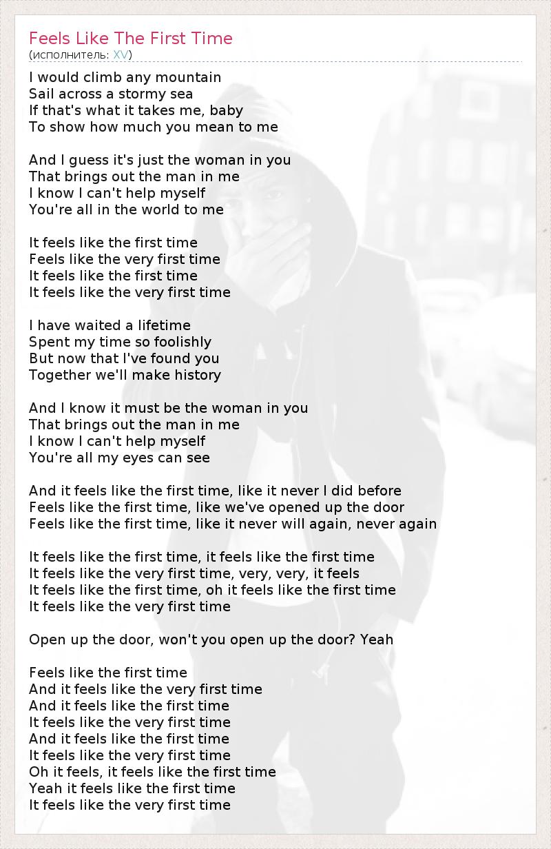 Я поднялся бы на любую гору Переплыл бы бурное море Если бы это позволило мне, малышка Показать, как много ты значишь для меня И я полагаю, что это просто женщина в тебе Которая пробуждает мужчину во мне Я знаю, что я не могу помочь себе Ты это все в мире для меня Чувствую себя как первый раз Чувствую себя как в самый первый раз Чувствую себя как в первый раз Чувствую себя как в самый первый раз Я ждал целую жизнь Проводил свое время так по-дурацки Но теперь, когда я нашел тебя Вместе мы сотворим историю И я знаю, что это просто женщина в тебе Которая пробуждает мужчину во мне Я знаю, что я не могу помочь себе Ты это все, что мои глаза могут видеть И чувствую себя как первый раз, как будто я никогда я делал этого прежде Чувствую себя как в первый раз, как будто мы открыли дверцу Чувствую себя как в первый раз, как будто это никогда не будет снова, никогда снова Чувствую себя как первый раз, чувствую себя как первый раз Чувствую себя как в самый первый раз, самый, самый Чувствую себя как первый раз, о чувствую себя как первый раз Чувствую себя как первый раз Открой дверцу, разве ты не откроешь дверцу? Да Чувствую себя как в первый раз И чувствую себя как в самый первый раз И чувствую себя как в первый раз Чувствую себя как в самый первый раз И чувствую себя как в первый раз Чувствую себя как в самый первый раз О чувствую, чувствую себя как в первый раз Да чувствую себя как в первый раз Чувствую себя как в самый первый раз