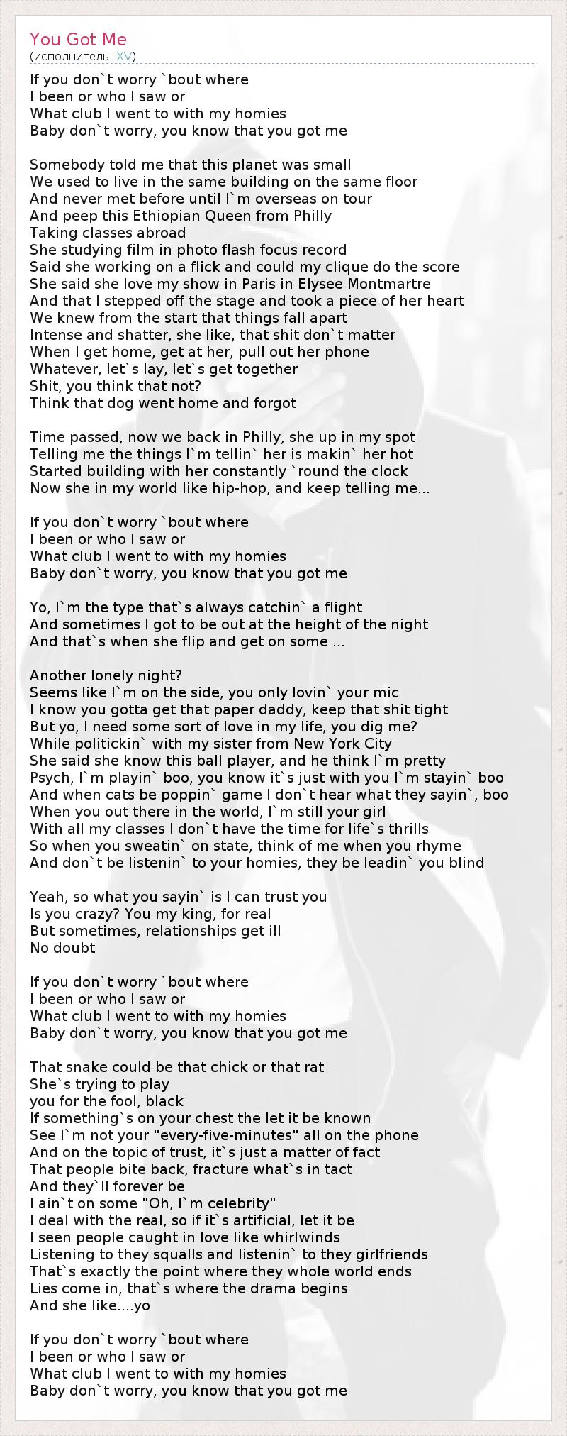 Baby don`t worry, you know that you got me