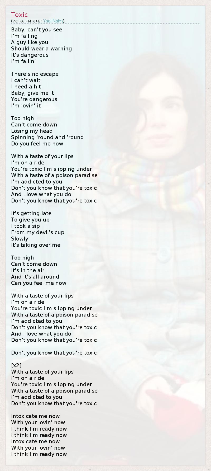 Baby, can't you see I'm falling A guy like you Should wear a warning It's dangerous I'm fallin' There's no escape I can't wait I need a hit Baby, give me it You're dangerous I'm lovin' it Too high Can't come down Losing my head Spinning 'round and 'round Do you feel me now With a taste of your lips I'm on a ride You're toxic I'm slipping under With a taste of a poison paradise I'm addicted to you Don't you know that you're toxic And I love what you do Don't you know that you're toxic It's getting late To give you up I took a sip From my devil's cup Slowly It's taking over me Too high Can't come down It's in the air And it's all around Can you feel me now With a taste of your lips I'm on a ride You're toxic I'm slipping under With a taste of a poison paradise I'm addicted to you Don't you know that you're toxic And I love what you do Don't you know that you're toxic Don't you know that you're toxic [x2] With a taste of your lips I'm on a ride You're toxic I'm slipping under With a taste of a poison paradise I'm addicted to you Don't you know that you're toxic Intoxicate me now With your lovin' now I think I'm ready now I think I'm ready now Intoxicate me now With your lovin' now I think I'm ready now