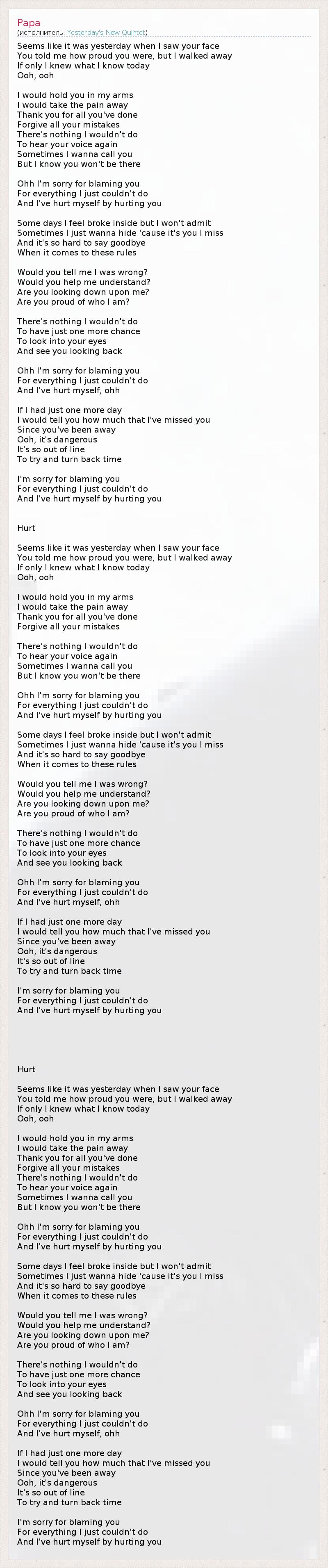 Seems like it was yesterday when I saw your face You told me how proud you were, but I walked away If only I knew what I know today Ooh, ooh I would hold you in my arms I would take the pain away Thank you for all you've done Forgive all your mistakes There's nothing I wouldn't do To hear your voice again Sometimes I wanna call you But I know you won't be there Ohh I'm sorry for blaming you For everything I just couldn't do And I've hurt myself by hurting you Some days I feel broke inside but I won't admit Sometimes I just wanna hide 'cause it's you I miss And it's so hard to say goodbye When it comes to these rules Would you tell me I was wrong? Would you help me understand? Are you looking down upon me? Are you proud of who I am? There's nothing I wouldn't do To have just one more chance To look into your eyes And see you looking back Ohh I'm sorry for blaming you For everything I just couldn't do And I've hurt myself, ohh If I had just one more day I would tell you how much that I've missed you Since you've been away Ooh, it's dangerous It's so out of line To try and turn back time I'm sorry for blaming you For everything I just couldn't do And I've hurt myself by hurting you Hurt Seems like it was yesterday when I saw your face You told me how proud you were, but I walked away If only I knew what I know today Ooh, ooh I would hold you in my arms I would take the pain away Thank you for all you've done Forgive all your mistakes There's nothing I wouldn't do To hear your voice again Sometimes I wanna call you But I know you won't be there Ohh I'm sorry for blaming you For everything I just couldn't do And I've hurt myself by hurting you Some days I feel broke inside but I won't admit Sometimes I just wanna hide 'cause it's you I miss And it's so hard to say goodbye When it comes to these rules Would you tell me I was wrong? Would you help me understand? Are you looking down upon me? Are you proud of who I am? There's nothing I wouldn't do To have just one more chance To look into your eyes And see you looking back Ohh I'm sorry for blaming you For everything I just couldn't do And I've hurt myself, ohh If I had just one more day I would tell you how much that I've missed you Since you've been away Ooh, it's dangerous It's so out of line To try and turn back time I'm sorry for blaming you For everything I just couldn't do And I've hurt myself by hurting you Hurt Seems like it was yesterday when I saw your face You told me how proud you were, but I walked away If only I knew what I know today Ooh, ooh I would hold you in my arms I would take the pain away Thank you for all you've done Forgive all your mistakes There's nothing I wouldn't do To hear your voice again Sometimes I wanna call you But I know you won't be there Ohh I'm sorry for blaming you For everything I just couldn't do And I've hurt myself by hurting you Some days I feel broke inside but I won't admit Sometimes I just wanna hide 'cause it's you I miss And it's so hard to say goodbye When it comes to these rules Would you tell me I was wrong? Would you help me understand? Are you looking down upon me? Are you proud of who I am? There's nothing I wouldn't do To have just one more chance To look into your eyes And see you looking back Ohh I'm sorry for blaming you For everything I just couldn't do And I've hurt myself, ohh If I had just one more day I would tell you how much that I've missed you Since you've been away Ooh, it's dangerous It's so out of line To try and turn back time I'm sorry for blaming you For everything I just couldn't do And I've hurt myself by hurting you