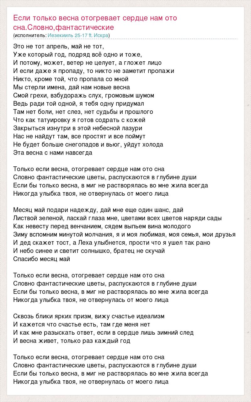 Это не тот апрель, май не тот, Уже который год, подряд всё одно и тоже, И потому, может, ветер не целует, а гложет лицо И если даже я пропаду, то никто не заметит пропажи Никто, кроме той, что пропала со мной Мы стерли имена, дай нам новые весна Смой грехи, взбудоражь слух, громовым шумом Ведь ради той одной, я тебя одну придумал Там нет боли, нет слез, нет судьбы и прошлого Что как татуировку я готов содрать с кожей Закрыться изнутри в этой небесной лазури Нас не найдут там, все простят и все поймут Не будет больше снегопадов и вьюг, уйдут холода Эта весна с нами навсегда Только если весна, отогревает сердце нам ото сна Словно фантастические цветы, распускаются в глубине души Если бы только весна, в миг не растворялась во мне жила всегда Никогда улыбка твоя, не отвернулась от моего лица Месяц май подари надежду, дай мне еще один шанс, дай Листвой зеленой, ласкай глаза мне, цветами всех цветов наряди сады Как невесту перед венчанием, сядем выпьем вина молодого Зиму вспомним минутой молчания, я и моя любимая, моя семья, мои друзья И дед скажет тост, а Леха улыбнется, прости что я ушел так рано И небо синее и светит солнышко, братец не скучай Спасибо месяц май Только если весна, отогревает сердце нам ото сна Словно фантастические цветы, распускаются в глубине души Если бы только весна, в миг не растворялась во мне жила всегда Никогда улыбка твоя, не отвернулась от моего лица Сквозь блики ярких призм, вижу счастье идеализм И кажется что счастье есть, там где меня нет И как мне разыскать ответ, если в сердце лишь зимний след И весна живет, только раз каждый год Только если весна, отогревает сердце нам ото сна Словно фантастические цветы, распускаются в глубине души Если бы только весна, в миг не растворялась во мне жила всегда Никогда улыбка твоя, не отвернулась от моего лица