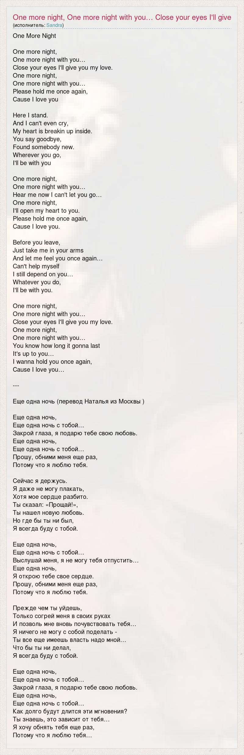 One More Night One more night, One more night with you… Close your eyes I'll give you my love. One more night, One more night with you… Please hold me once again, Cause I love you Here I stand. And I can't even cry, My heart is breakin up inside. You say goodbye, Found somebody new. Wherever you go, I'll be with you One more night, One more night with you… Hear me now I can't let you go… One more night, I'll open my heart to you. Please hold me once again, Cause I love you. Before you leave, Just take me in your arms And let me feel you once again… Can't help myself I still depend on you… Whatever you do, I'll be with you. One more night, One more night with you… Close your eyes I'll give you my love. One more night, One more night with you… You know how long it gonna last It's up to you… I wanna hold you once again, Cause I love you… --- Еще одна ночь (перевод Наталья из Москвы ) Еще одна ночь, Еще одна ночь с тобой… Закрой глаза, я подарю тебе свою любовь. Еще одна ночь, Еще одна ночь с тобой… Прошу, обними меня еще раз, Потому что я люблю тебя. Сейчас я держусь. Я даже не могу плакать, Хотя мое сердце разбито. Ты сказал: «Прощай!», Ты нашел новую любовь. Но где бы ты ни был, Я всегда буду с тобой. Еще одна ночь, Еще одна ночь с тобой… Выслушай меня, я не могу тебя отпустить… Еще одна ночь, Я открою тебе свое сердце. Прошу, обними меня еще раз, Потому что я люблю тебя. Прежде чем ты уйдешь, Только согрей меня в своих руках И позволь мне вновь почувствовать тебя… Я ничего не могу с собой поделать - Ты все еще имеешь власть надо мной… Что бы ты ни делал, Я всегда буду с тобой. Еще одна ночь, Еще одна ночь с тобой… Закрой глаза, я подарю тебе свою любовь. Еще одна ночь, Еще одна ночь с тобой… Как долго будут длится эти мгновения? Ты знаешь, это зависит от тебя… Я хочу обнять тебя еще раз, Потому что я люблю тебя…