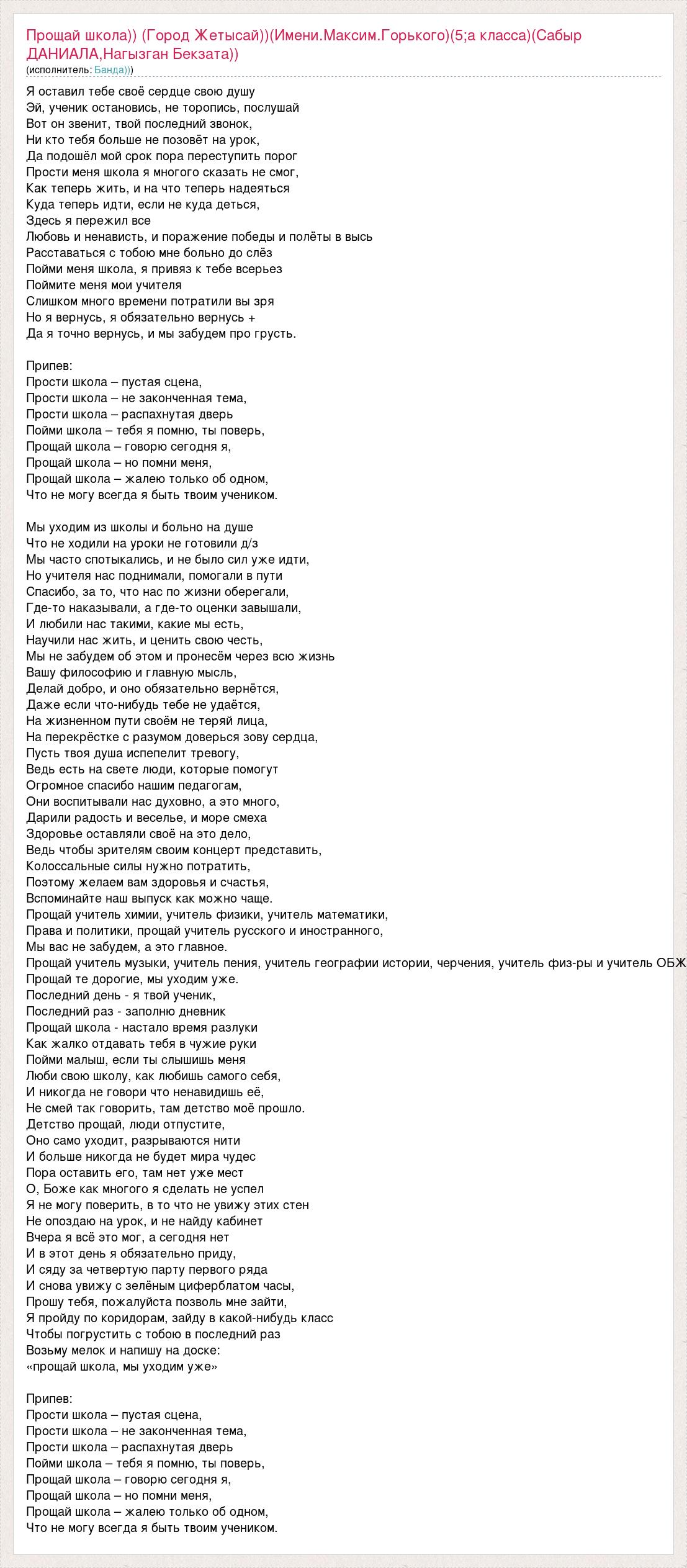 Главная→Исполнители→Банда))→Прощай школа)) (Город Жетысай))(Имени.Максим.Горького)(5;а класса)(Сабыр ДАНИАЛА