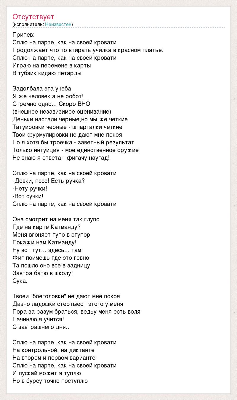 Припев: Сплю на парте, как на своей кровати Продолжает что то втирать училка в красном платье. Сплю на парте, как на своей кровати Играю на перемене в карты В тубзик кидаю петарды Задолбала эта учеба Я же человек а не робот! Стремно одно... Скоро ВНО (внешнее незавизимое оценивание) Деньки настали черные,но мы же четкие Татуировки черные - шпаргалки четкие Твои фурмулировки не дают мне покоя Но я хотя бы троечка - заветный результат Только интуиция - мое единственное оружие Не знаю я ответа - фигачу наугад! Сплю на парте, как на своей кровати -Девки, пссс! Есть ручка? -Нету ручки! -Вот сучки! Сплю на парте, как на своей кровати Она смотрит на меня так глупо Где на карте Катманду? Меня вгоняет тупо в ступор Покажи нам Катманду! Ну вот тут... здесь... там Фиг поймешь где это говно Та пошло оно все в задницу Завтра батю в школу! Сука. Твоеи "боеголовки" не дают мне покоя Давно ладошки стертыеот этого у меня Пора за разум браться, ведьу меня есть воля Начинаю я учится! С завтрашнего дня.. Сплю на парте, как на своей кровати На контрольной, на диктанте На втором и первом варианте Сплю на парте, как на своей кровати И пускай может я туплю Но в бурсу точно поступлю